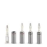 Вилки мають спеціальну обробку (посріблення), яка зводить до мінімуму спотворення. Ковпачки з анодованого алюмінію забезпечують чудовий захист сигналу. Ці нові BP400 підходять для кабелів із поперечним перетином до 3,8 мм2 і доступні в пучках по 4 вилки.