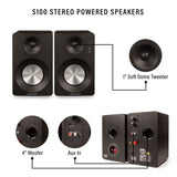 Створені спеціально для програвача, наші колонки S100 мають потужність 120 Вт і найсучасніший зв'язок Bluetooth. Створені для поєднання шарму старої школи з сучасною функціональністю, ці активні колонки 2.0 для книжкових полиць додадуть сучасний стиль до вашої системи програвача. Кожна колонка має 4-дюймовий низькочастотний динамік і 1-дюймовий твітер з м'яким куполом, що забезпечує захоплюючий стереозвук. Ці колонки можна підключити до програвача або стереосистеми через Bluetooth або за допомогою додаткового входу. Незалежно від обраного вами способу підключення, ці колонки легко налаштовуються, забезпечуючи бездоганну роботу за принципом plug-and-play.