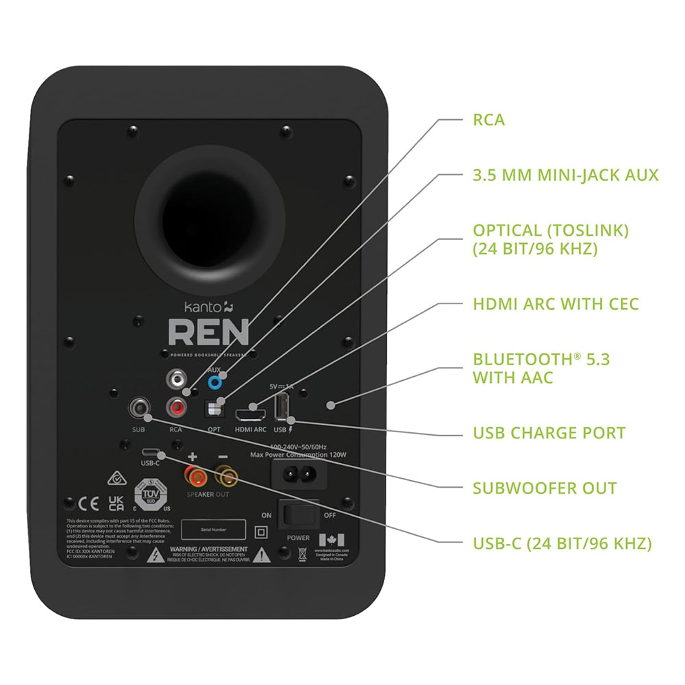 Kanto REN поєднує зручність використання саундбара та точність стереосистеми, керованої DSP, REN, забезпечуючи високоякісне звучання з будь-яким сучасним телевізором через HDMI ARC. Це дає вам можливість створити кінозал вдома в одному компактному пакеті. REN вирішує проблему тихих діалогів і надмірно гучних звукових ефектів завдяки двом режимам звуку, що підсилюють голоси та знижують низькі частоти для зручного перегляду вночі. Коли ви захочете підключити сабвуфер, REN автоматично фільтрує суб-бас зі своїх 5,25-дюймових алюмінієвих динаміків, даючи їм можливість фокусуватися на середніх частотах з мінімальними спотвореннями. REN пропонує універсальність за межами вітальні: Bluetooth 5.3 для підключення до смарт-пристроїв, оптичний вхід для потокових сервісів Wi-Fi, USB-C для використання на комп'ютері та аналогові входи для всього іншого.