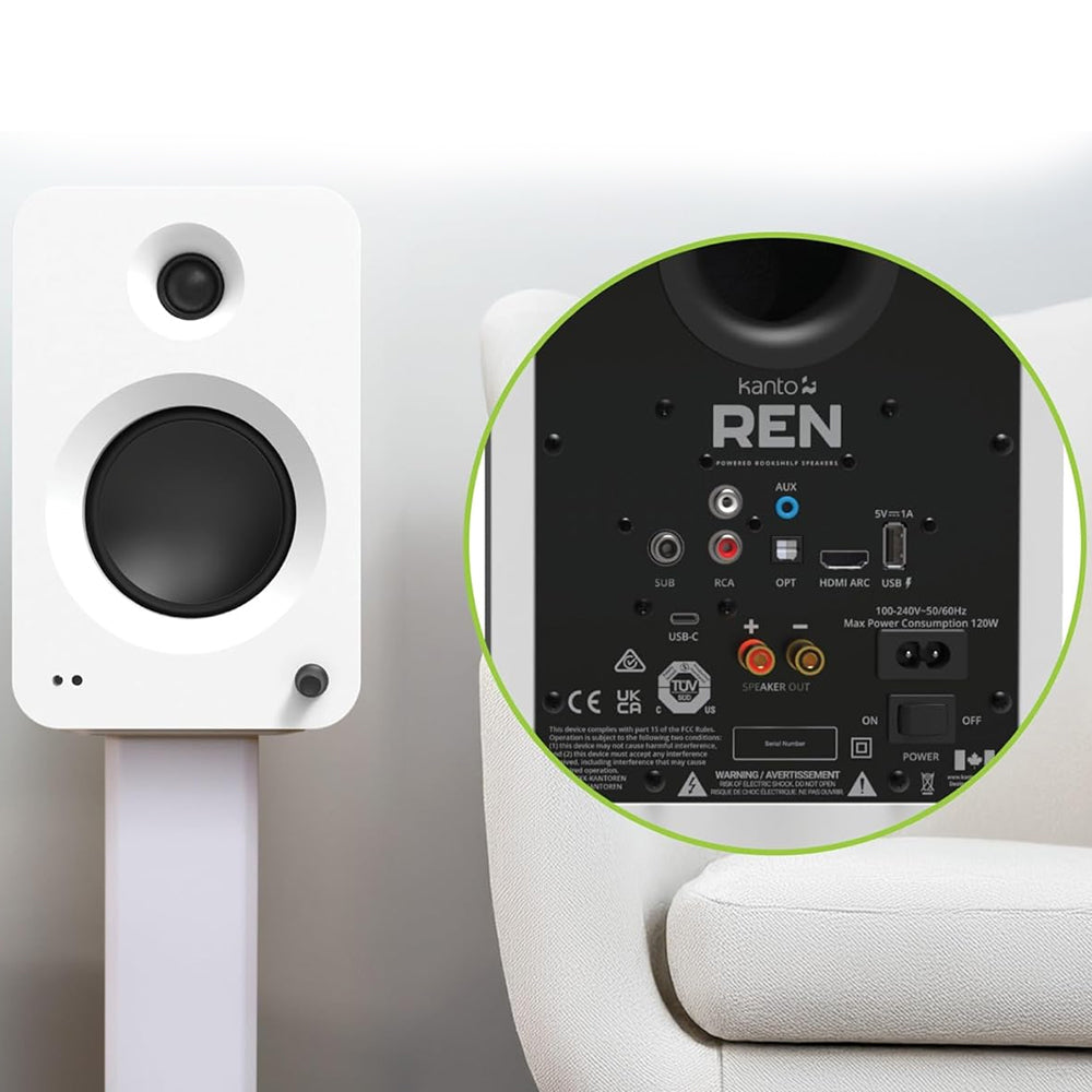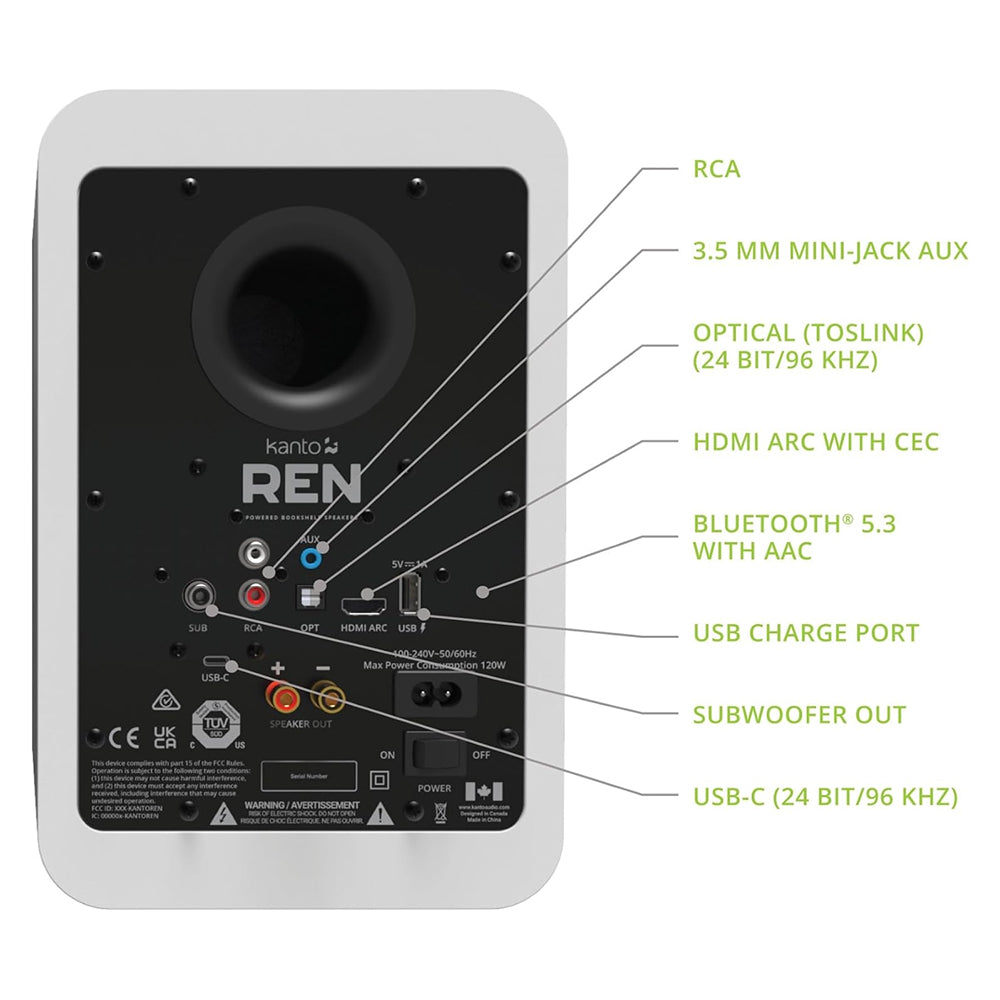 Kanto REN поєднує зручність використання саундбара та точність стереосистеми, керованої DSP, REN, забезпечуючи високоякісне звучання з будь-яким сучасним телевізором через HDMI ARC. Це дає вам можливість створити кінозал вдома в одному компактному пакеті. REN вирішує проблему тихих діалогів і надмірно гучних звукових ефектів завдяки двом режимам звуку, що підсилюють голоси та знижують низькі частоти для зручного перегляду вночі. Коли ви захочете підключити сабвуфер, REN автоматично фільтрує суб-бас зі своїх 5,25-дюймових алюмінієвих динаміків, даючи їм можливість фокусуватися на середніх частотах з мінімальними спотвореннями. REN пропонує універсальність за межами вітальні: Bluetooth 5.3 для підключення до смарт-пристроїв, оптичний вхід для потокових сервісів Wi-Fi, USB-C для використання на комп'ютері та аналогові входи для всього іншого.