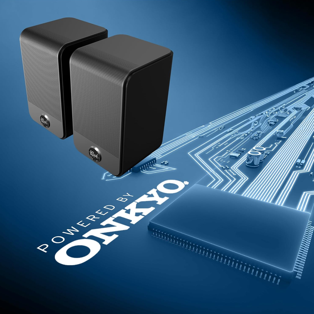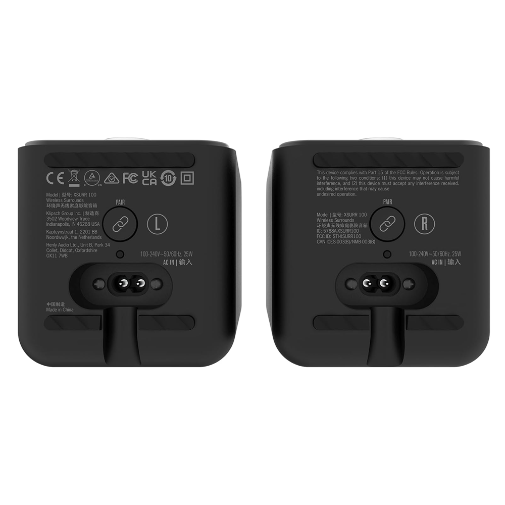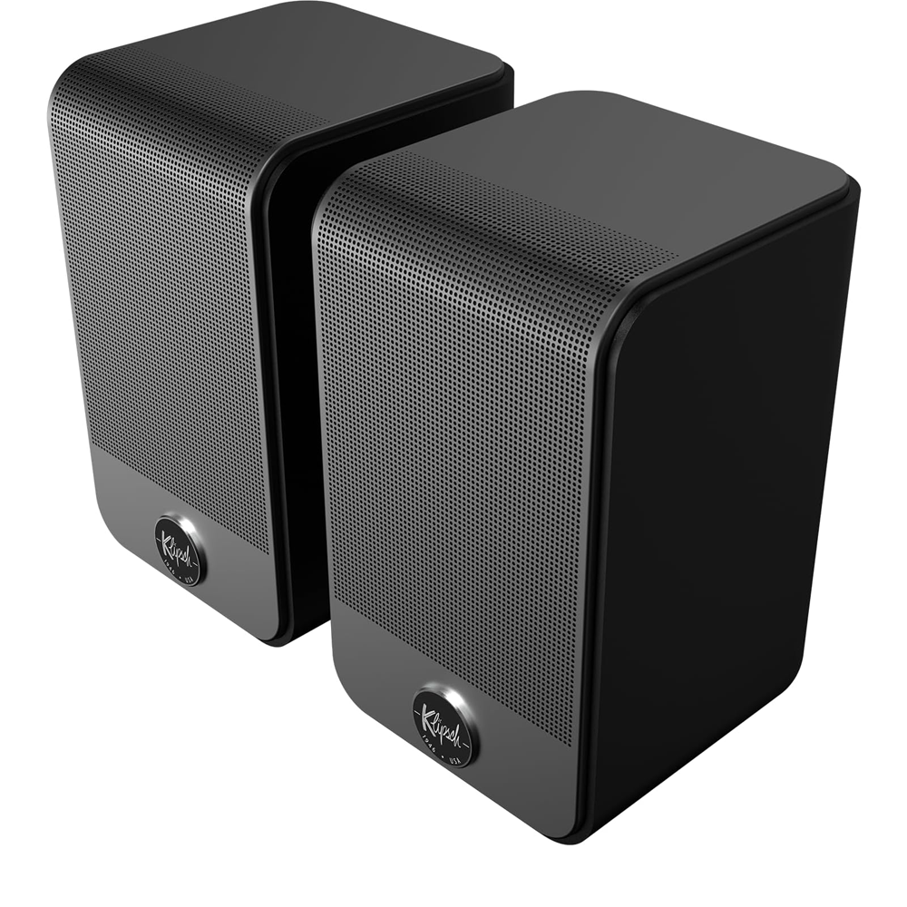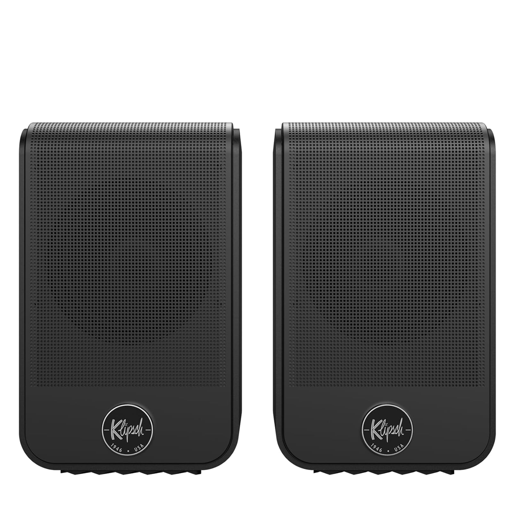 Klipsch Flexus Surround 100 — бездротова тилова акустика з оздобленням під дерево, металевою сіткою та чорною тканиною.