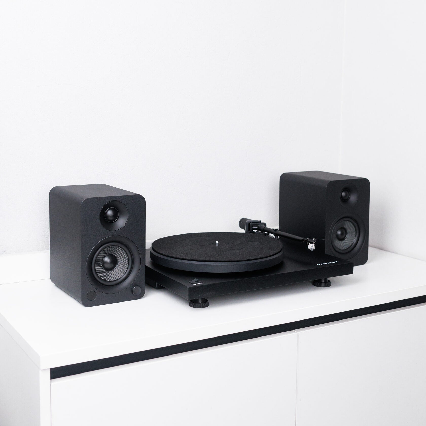 Crosley C6 оснащений пасовим приводом і тонармом з алюмінієвою трубкою, що забезпечує стабільне обертання та точне зчитування сигналу. Картридж MM гарантує чистий і деталізований звук, а вбудований фонокоректор дозволяє підключати програвач безпосередньо до активних колонок. Kanto YU4 із вбудованим підсилювачем відтворює насичений бас і чисті високі частоти, підтримує RCA, AUX, оптичний вхід та Bluetooth, що робить систему універсальною та легкою у використанні.