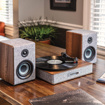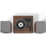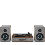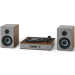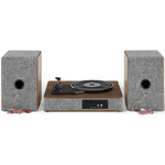 Ця стильна система в сірої тканині з дерев’яними елементами горіха і сріблястими акцентами не тільки гарно виглядає, а й звучить потужно: тришвидкісний програвач підтримує 33 1/3, 45 і 78 обертів на хвилину, оснащений голкою NP16, FM-радіо та додатковим входом. Потужність динаміків — 2х25 Вт.