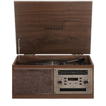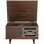 Програвач Serenade 8-в-1 об'єднує всі ваші музичні потреби в одному ретро-пристрої. Ви можете слухати вінілові платівки, касети, CD-диски, радіо або використовувати Bluetooth для стрімінгу цифрових плейлистів. Цей розважальний центр оснащений знімними стійками з елегантними золотими акцентами, що додає вашому інтер'єру стильний вигляд в стилі середини ХХ століття.