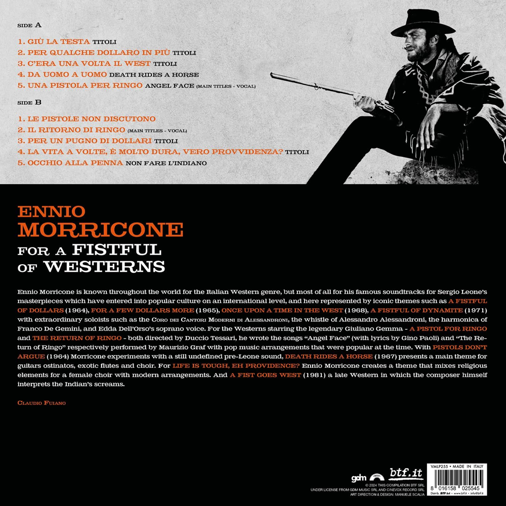 Ця вінілова платівка представляє "For A Fistful Of Westerns" – збірку музики видатного італійського композитора Енніо Морріконе. Це видання є "Limited Edition" (лімітованим) і випущене на привабливому прозоро-помаранчевому (Clear Orange Vinyl) вінілі, що робить його особливо бажаним для колекціонерів та шанувальників саундтреків. Цей альбом є компіляцією його легендарних творів, які визначили жанр спагетті-вестерну.