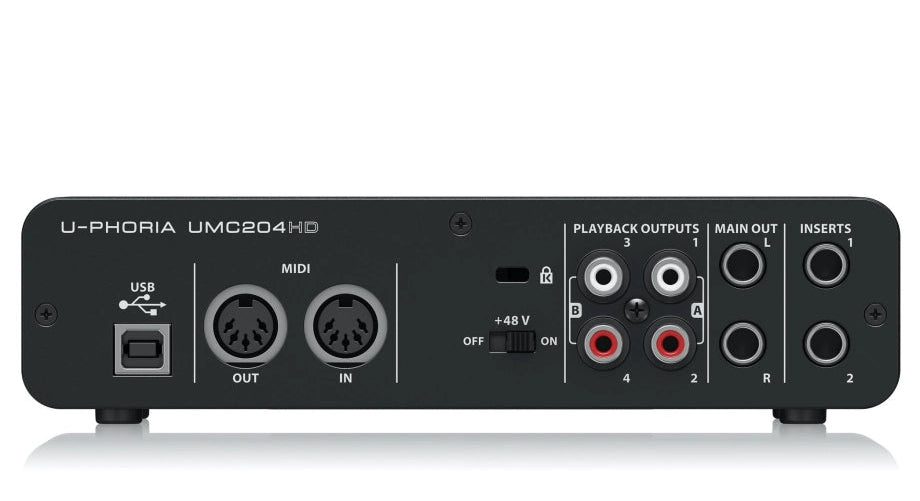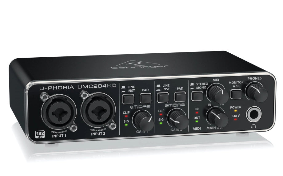 Behringer UMC204HD — це професійний USB-аудіоінтерфейс 2x4, розроблений для високоякісного запису та відтворення звуку. Він оснащений двома комбінованими входами XLR/TRS з фантомним живленням, що дозволяє підключати мікрофони, інструменти та лінійні джерела сигналу.