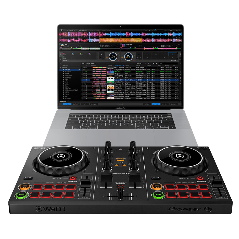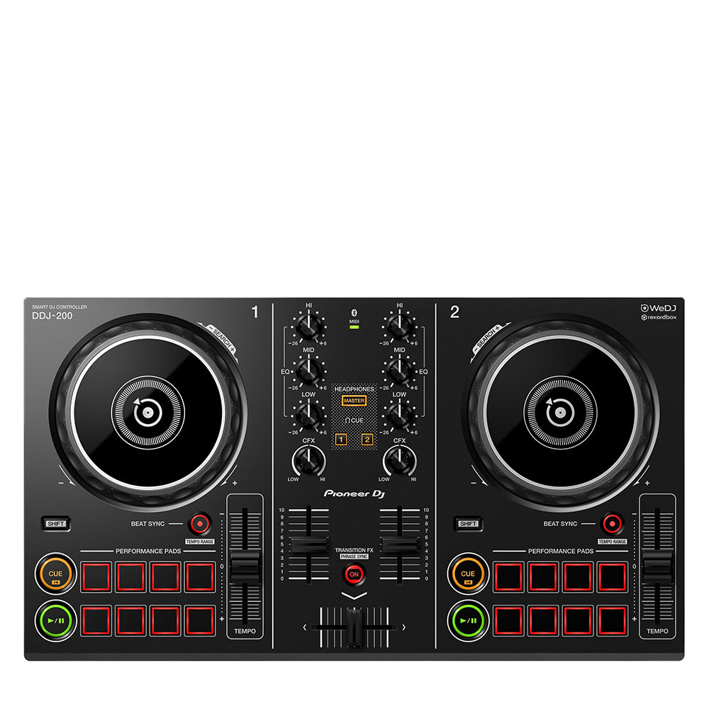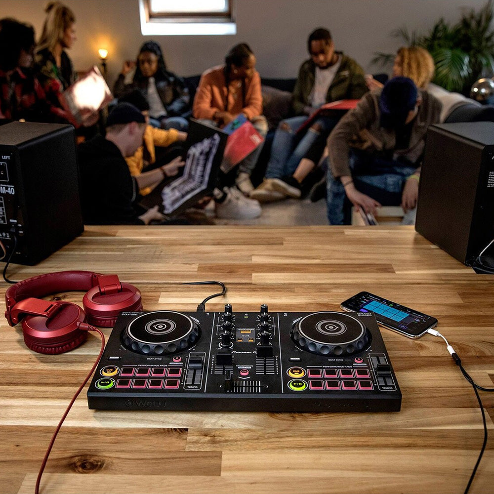 Pioneer DDJ-200 - інтелектуальний DJ контролер початкового рівня, сумісний з WeDJ, djay і edjing Mix. Легкий і компактний двоканальний контролер із професійною розкладкою допоможе діджеям-початківцям навчитися міксувати треки та вдосконалювати свої навички. Контролер дає змогу відтворювати треки зі смартфона або комп'ютера, використовуючи популярні застосунки WeDJ, rekordbox, djay і edjing Mix, міксувати музику з iTunes або rekordbox, а також відтворювати треки з потокових сервісів Beatport і Deezer. Контролер оснащений функцією спливаючих підказок у WeDJ, а також дає змогу безплатно використовувати всі платні функції в WeDJ для iPhone. Також доступні функція Phrase Sync, яка поєднує позиції двох треків, забезпечуючи більш природне перемикання між композиціями. Split-кабель дає змогу розділяти вихідний сигнал і працювати з наступним треком у навушниках, поки поточний трек звучить через колонки. DDJ-200 - легкий і компактний контролер, що дає змогу відтворювати звук зі смартфона, планшета або комп'ютера за допомогою підключення до аудіовходу. Може живитися від будь-якого зовнішнього джерела через USB.