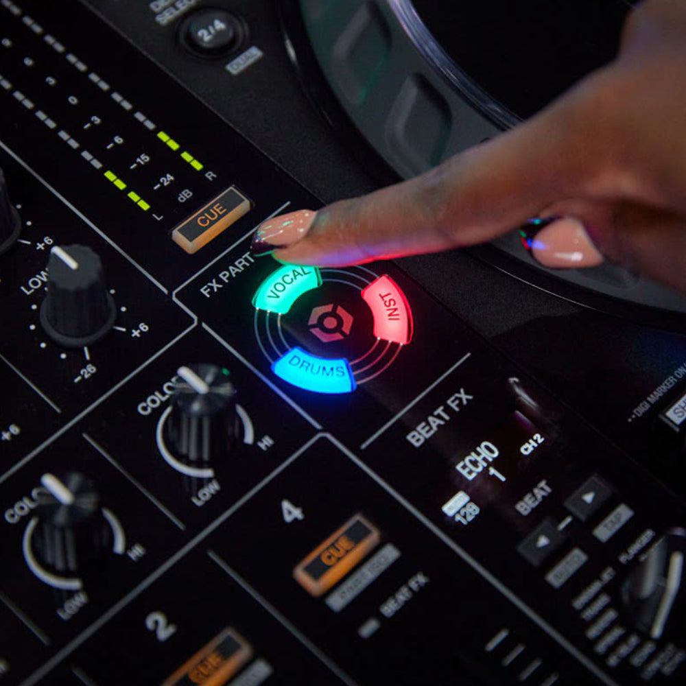 Вперше вбудовано в контролер Pioneer: функція поділу доріжок . Ця інтуїтивно зрозуміла функція дозволяє завантажувати треки з вашої бібліотеки, а потім розділяти вокал, барабани та інструменти для інноваційних реміксів і сумішей.