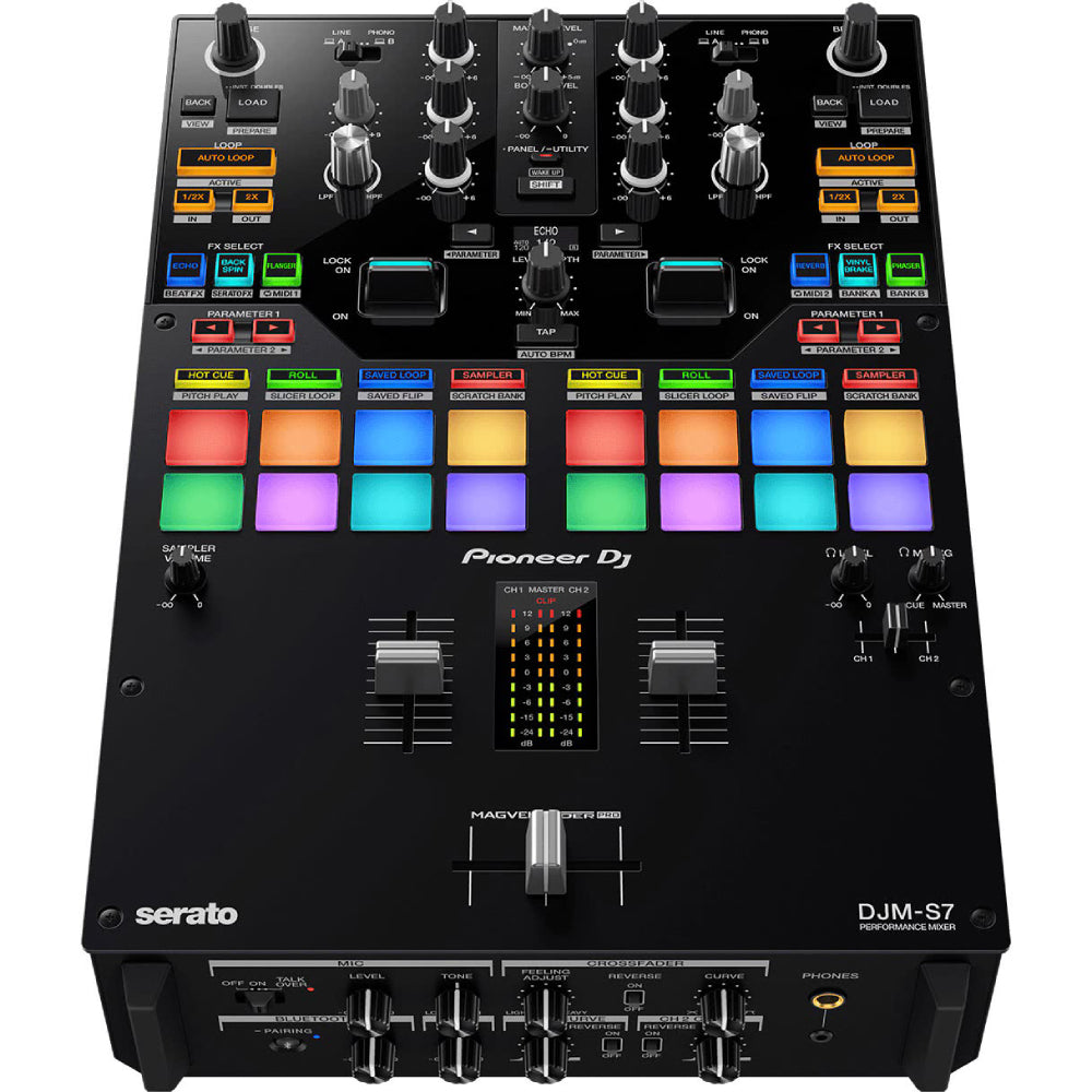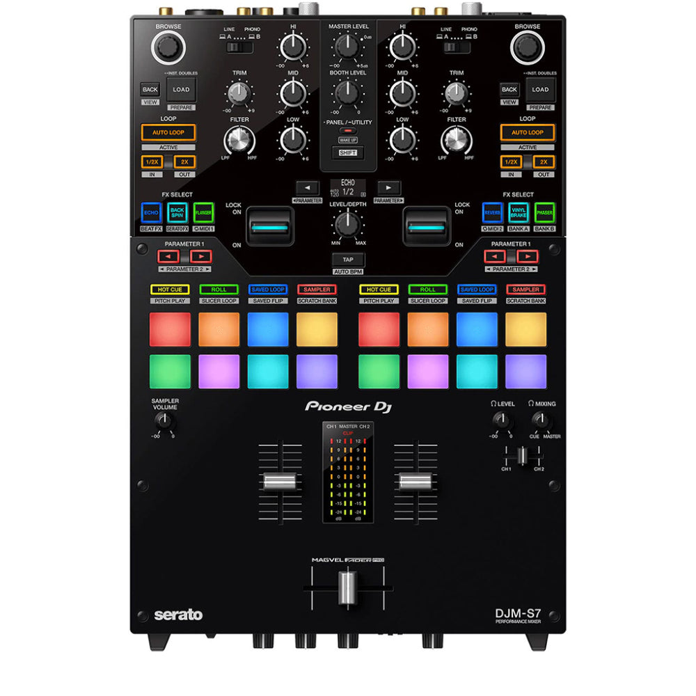 Новий 2-канальний мікшер Pioneer DJM-S7 підтримує rekordbox та Serato DJ, забезпечуючи всі необхідні можливості для діджеїв. Завдяки Bluetooth (V5.0), можна транслювати треки або семпли зі смартфона. Мікшер має подвійний аудіоінтерфейс USB, педи 2x8 і 22 ефекти Beat FX з DJM-S11. Особливістю є функція Loop Midi, яка дозволяє керувати Serato чи rekordbox через важіль ефектів. Мікшер також підтримує анімовані ефекти від DJM-S11 для швидкої активації. Підключення до rekordbox або Serato DJ за принципом Plug&Play — просто підключіть мікшер і він автоматично активується.