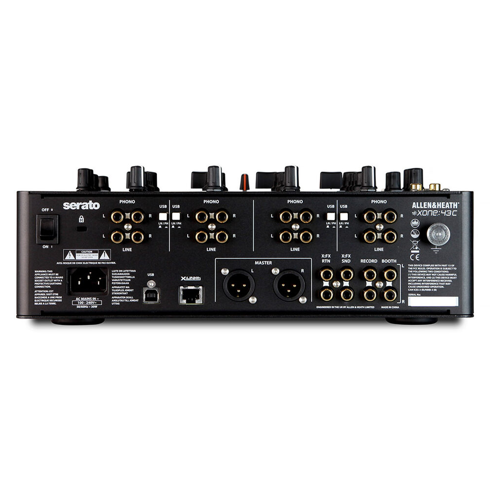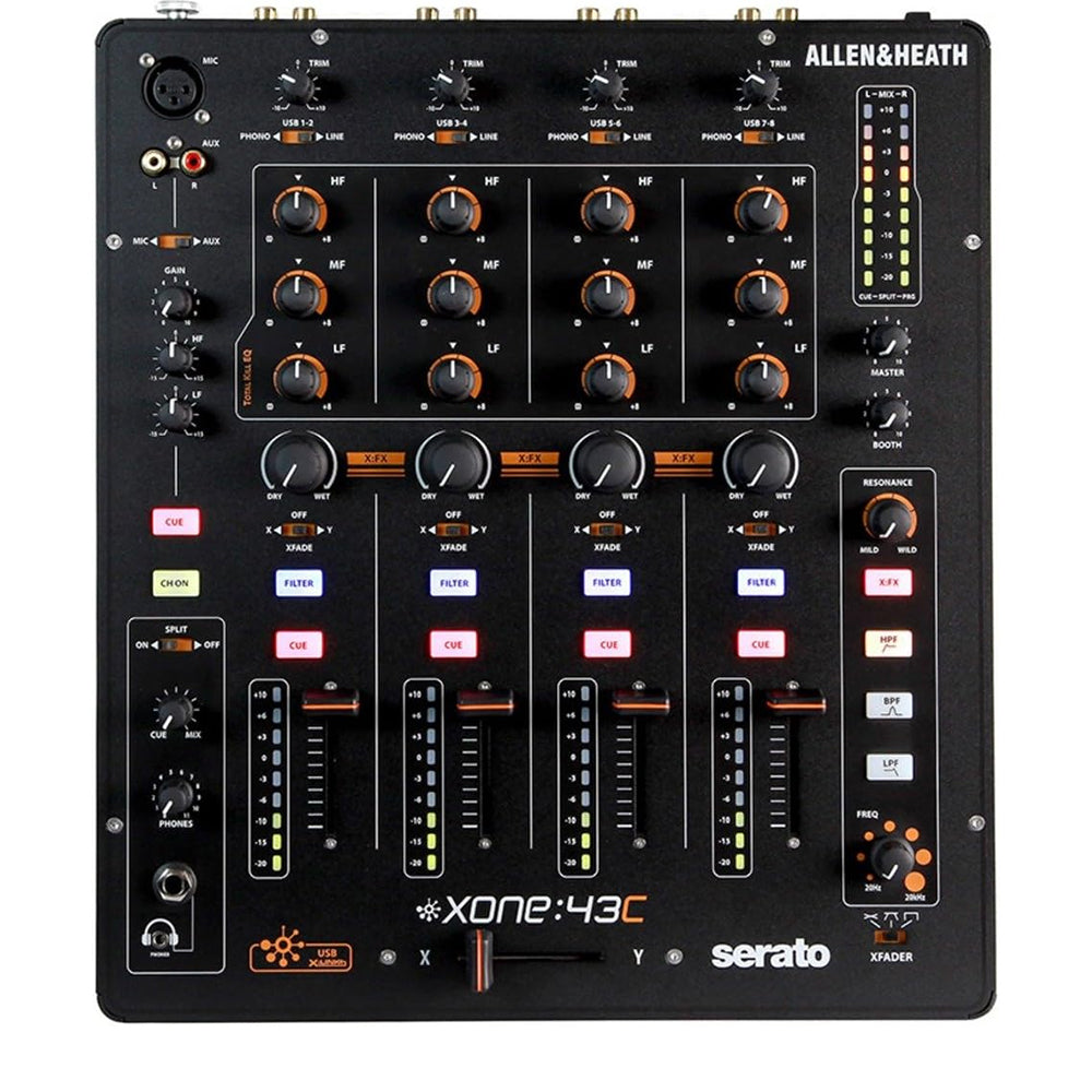 Мікшер Allen & Heath Xone:43C з вбудованим USB-аудіоінтерфейсом спрощує налаштування сета, усуваючи необхідність у зовнішньому інтерфейсі. Він має чотири канали для фоно/USB/лінійних входів, а також додатковий mic/aux вхід для підключення мікрофона без втрати інших каналів. Порт X:Link дозволяє підключати контролери Xone:K для розширення сета. Завдяки потужним звуковим фільтрам, ефектам і високій надійності, цей мікшер є відмінним вибором для багатьох діджеїв.