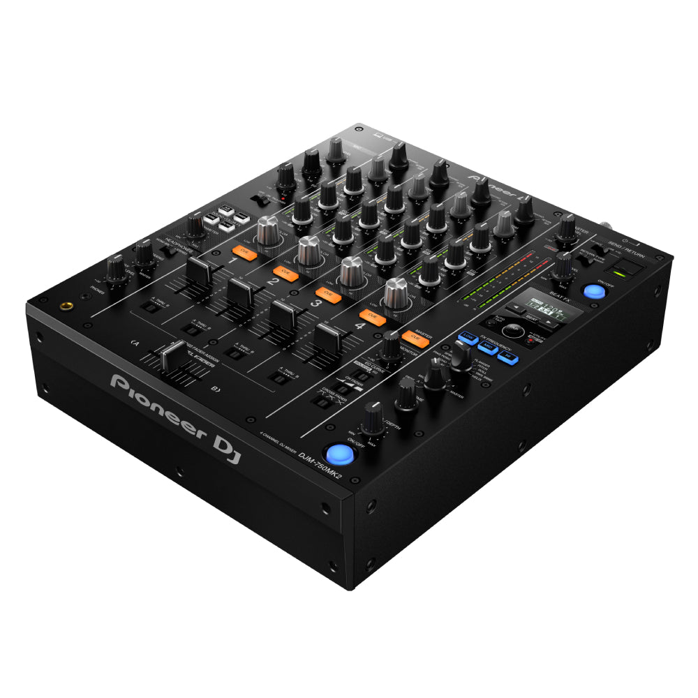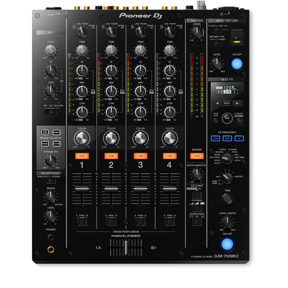 Pioneer DJM-750MK2 - 4-х канальний мікшер. Є оновленою версією моделі DJM-750. Оснащений 24-бітовим USB-інтерфейсом, двома секціями високоякісних ефектів: Beat FX (з підтримкою FX Frequency) і Sound Color FX, зносостійким магнітним кроссфейдером Magvel Fader. Дана модель забезпечує високу якість звуку, має поліпшені криві еквалайзера і канальних фейдерів, незалежну мікрофонну секцію з 2-х смуговим еквалайзером. Також DJM-750MK2 оснащений додатковими USB-портами для iOS-пристроїв. У комплекті поставляються Rekordbox DJ і Rekordbox DVS.