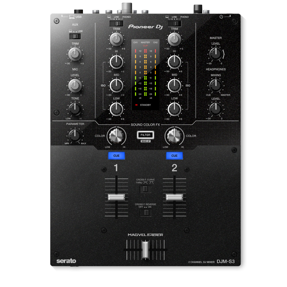 Pioneer DJM-S3 - двоканальний мішкер із вбудованою звуковою картою з підтримкою Serato DVS, що є головною відмінністю від мікшера DJM-250MK2. Новинка оснащена деякими особливостями топових DJM-900NXS2 і DJM-S9. Розробники оснастили мікшер високоякісним Magvel фейдером, який ідеально підійде для скретчу. Серед інших переваг DJM-S3 слід відзначити наявність виділеної мікрофонної секції і незалежних фільтрів Sound Color FX, міцну конструкцію корпусу і, зрозуміло, ліцензію Serato DJ і Serato DVS у комплекті.
