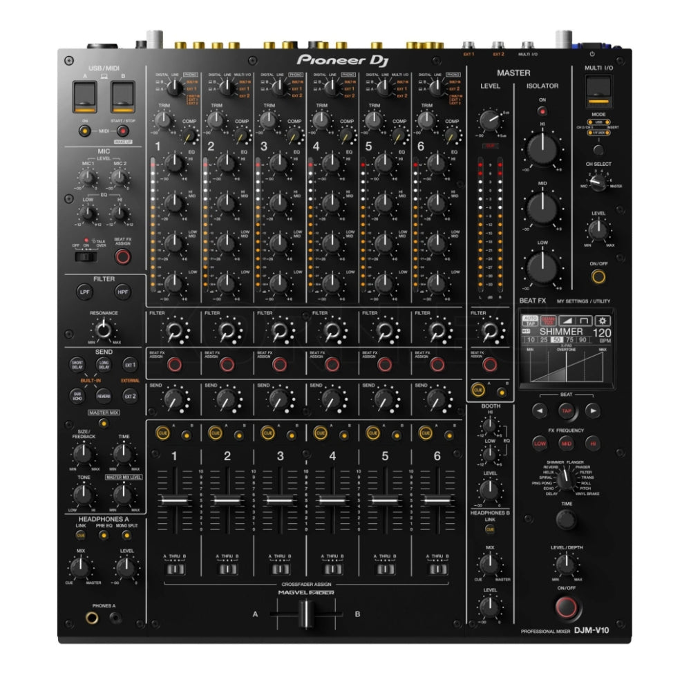 Pioneer DJM-V10 - 6-канальний професійний DJ мікшер нового типу з унікальними характеристиками. Мікшер пропонує безпрецедентну якість 96-кГц/64-біта, цифрове оброблення в DSP, а також високоякісні 32-бітові аналого-цифрові та цифро-аналогові перетворювачі й синхронізатор із низьким джиттером. 6 каналів з різними типами входів допоможуть створити ідеальний сетап і підключити будь-яке обладнання, від CDJ і вертушок до семплерів, синтезаторів і драм-машин. Мікшер оснащений новим 4-смуговим еквалайзером. Вбудований компресор дає змогу налаштувати гучність ваших треків. Розширена секція Send-Return дає змогу додавати зовнішні ефекти FX або комбінувати їх із вбудованими FX. 3-смуговий майстер ізолятор з новою функцією посилення/обрізки кривих і налаштуванням частот кросовера та інших параметрів, дає змогу з легкістю керувати тональністю всього міксу. Два виходи для навушників і еквалайзера дадуть змогу двом діджеям зручно здійснювати моніторинг. Фіксація шнура живлення забезпечує надійність під'єднання, запобігає його випадковому відключенню від мережі. Запишіть і заархівуйте свої мікси через iPhone або iPad, завантажте з у хмарний сервіс або з легкістю здійснюйте пряму трансляцію своїх сесій. Також доступна функція DVS з низькою затримкою, що дає змогу керувати і скретчити з CDJ або вертушок за допомогою rekordbox, Serato DVS (ліцензія на Serato DJ Club Kit продається окремо, скоро буде сумісною з Serato DJ Pro) або TRAKTOR PRO 3 (продається окремо). Крім того, DJM-V10 підтримує розширений протокол PRO DJ LINK ShowKontrol, який дає змогу використовувати всю основну інформацію з DJM-V10, налаштовувати звук і відео для створення шоу.