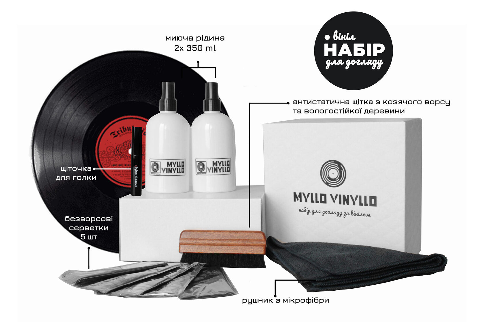 Комплект включає щітку з натурального козячого ворсу, кілька серветок з мікрофібри, рідину для очищення без спиртів і шкідливих компонентів, рушник з м’якої мікрофібри та щіточку для очищення стилуса. Матеріали добірні, дизайн зручний у використанні, щоб процедури очищення були максимально ефективними і безпечними для вінілових носіїв.