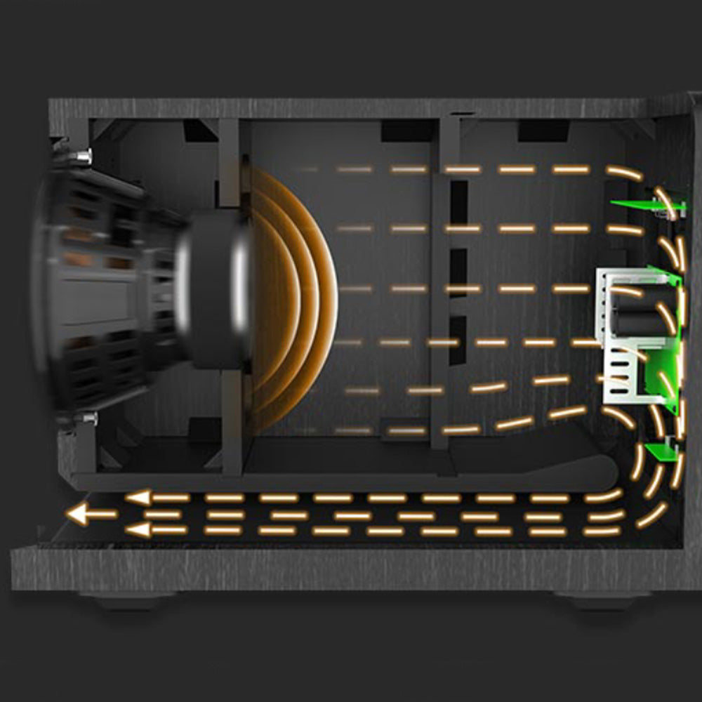 Стійке до подряпин вінілове покриття чорного дерева виглядає як справжнє дерево та покриває весь корпус. Закруглені кути, гумові ніжки, що амортизують, стійки зі сталевої сітки і міцна сітка з тканого матеріалу гарантують першокласну естетику.