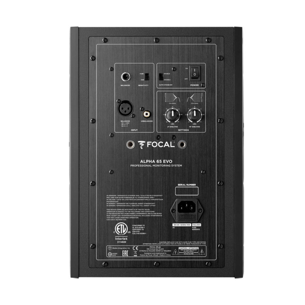 Focal Alpha 65 EVO - оновлена версія студійного монітора Alpha 65. Від попередньої моделі Evo відрізняються зміненим дизайном корпусу, новим НЧ-динаміком, переробленою схемою фазоінвертора і наявністю stand-by режиму. Монітори мають кращі показники по спотвореннях і пропонують якісний нейтральний звук з рівним тональним балансом на будь-яких рівнях гучності. Alpha 65 Evo оснащується 1" інвертованим твітером з алюмінію і 6.5" НЧ динаміком з матеріалу Slatefiber, що являє собою суміш перероблених вуглецевих волокон і спеціального термопластичного полімеру. Комбінація забезпечує чудові характеристики за швидкістю звуку, демпфіруванням і жорсткістю динаміка. Підсилювачі монітора працюють у D класі. Alpha Evo має stand-by функцію, що переводить його в режим очікування за відсутності сигналу впродовж 15 хвилин, яку можна відключити за допомогою перемикача на задній панелі. Є регулятори для посилення / ослаблення НЧ і ВЧ і перемикач чутливості входів. Для комутації передбачено XLR, RCA і TRS роз'єми. У комплекті з монітором поставляється набір решіток, призначених для захисту динаміків.