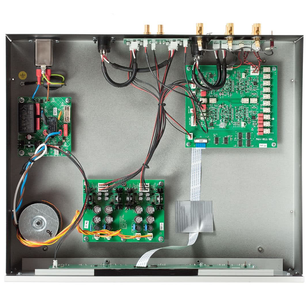 M3X Vinyl має мінімалістичний корпус з продуманою конструкцією, яка не тільки забезпечує ефективне екранування, але й дозволяє розмістити окремі частини схеми на достатній відстані одна від одної. Це знижує шкідливий вплив блоку живлення на підсилювальні каскади. Додатково, тороїдальний трансформатор з низьким рівнем насичення сердечника підвищує ефективність роботи пристрою.
