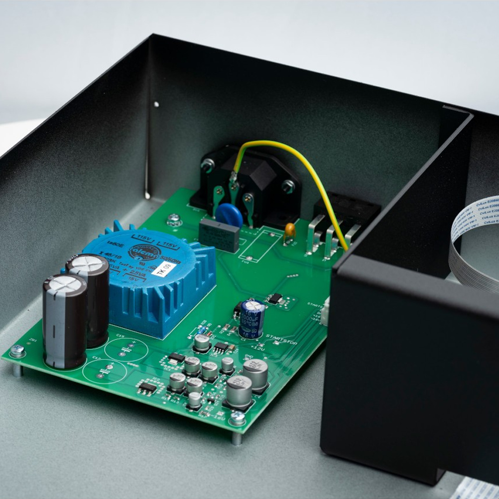 M3X Vinyl має мінімалістичний корпус з продуманою конструкцією, яка не тільки забезпечує ефективне екранування, але й дозволяє розмістити окремі частини схеми на достатній відстані одна від одної. Це знижує шкідливий вплив блоку живлення на підсилювальні каскади. Додатково, тороїдальний трансформатор з низьким рівнем насичення сердечника підвищує ефективність роботи пристрою.
