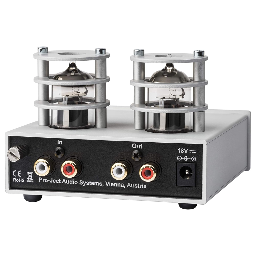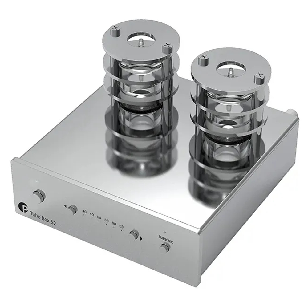 Фонокоректор Pro-Ject Tube Box S2 побудований на двох лампах ECC83 — по одній на канал — і забезпечує м’яке, збалансоване звучання без спотворень у широкому діапазоні частот. Металевий корпус із алюмінію та сталі надійно захищає схеми від електричних завад і вібрацій. Лампи частково виступають з корпусу для кращого охолодження та зручної заміни, а металеві кільця захищають їх від пошкоджень.