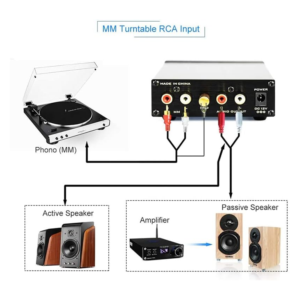 Пристрій має вхід PHONO (MM) та вихід RCA, що дозволяє легко підключати його до будь-якої аудіосистеми. Вхідний опір становить 47 кОм, а співвідношення сигнал/шум — 80 дБ, що гарантує чисте звучання. Коефіцієнт спотворень становить всього 0,008%, забезпечуючи точне відтворення та високу якість звуку.