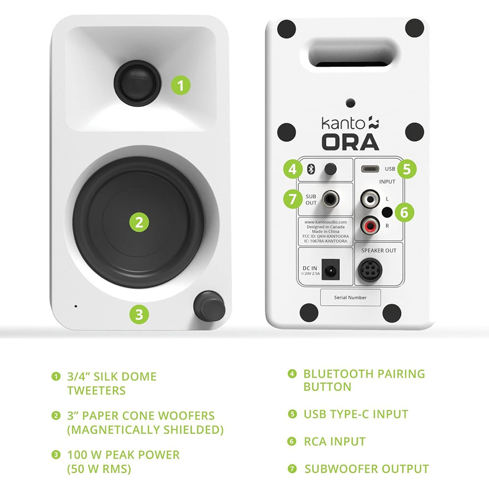 Творець. Геймер. Музикант. ORA стирає межі між комп'ютерними колонками та студійними моніторами, надаючи вам звук професійного рівня, схвалений аудіофілами, без зайвого захоплення простору. ORA має сучасні входи, такі як USB-C для найкращого звучання з вашого ПК або Mac, Bluetooth 5.0 для підключення до телефону чи смарт-пристроїв, а також RCA для аналогового обладнання. Завдяки кросоверу, який автоматично передає бас на підключений сабвуфер, ви отримуєте ідеальну інтеграцію низьких частот, звільняючи 3-дюймові низькочастотні динаміки та ¾-дюймові шовкові твіттери, щоб вони могли зосередитися на тому, що вони роблять найкраще. ORA — це ідеальне поєднання звуку еталонної якості та сучасних функцій у компактному форматі, що ідеально підійде для вашого робочого місця.