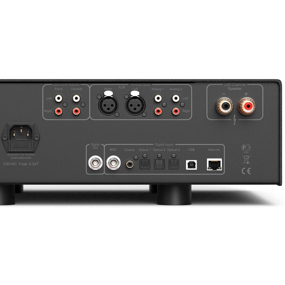 На задній панелі розташовано пару балансних входів XLR і дві пари аналогових RCA, які, як і інші входи, можуть працювати з фіксованим або змінним рівнем сигналу. Усі цифрові входи маршрутизуються через DSP USB, що дає змогу відтворювати MQA та DSD через SPDIF і додатково знижує рівень джитеру.