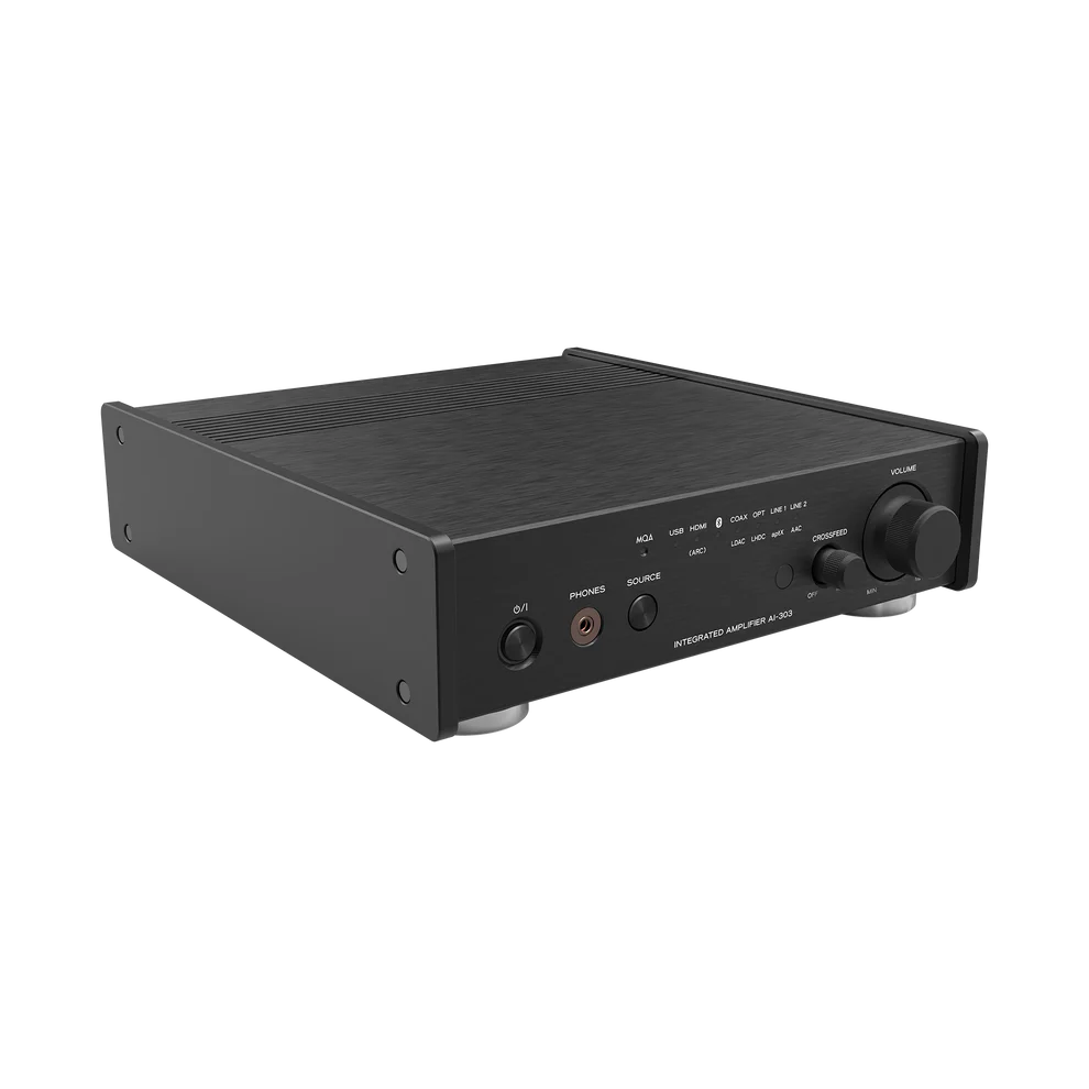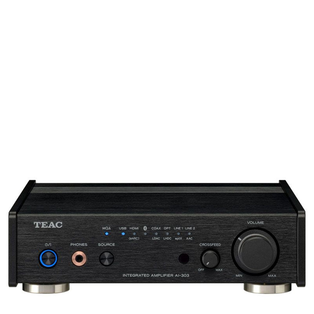 TEAC AI-303 — інтегральний підсилювач компактного класу, побудований на енергоефективних модулях Hypex NCore. Модель спроєктована для роботи з цифровими джерелами високої роздільної здатності та інтеграції в сучасні мультимедійні системи. Вбудований USB-ЦАП підтримує нативне відтворення форматів DSD512 та PCM до 32 біт / 384 кГц, що забезпечує точне декодування аудіосигналу з мінімальним рівнем фазового шуму.