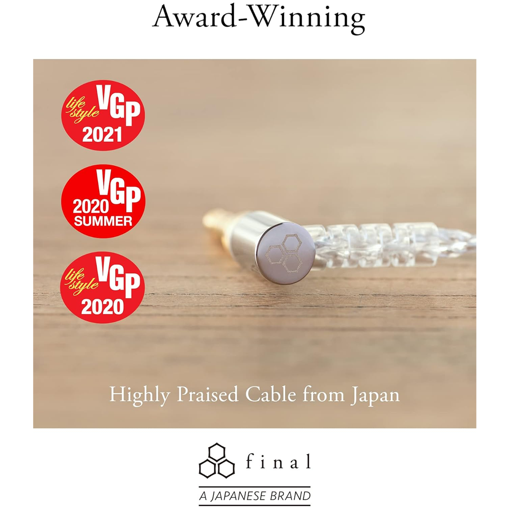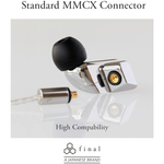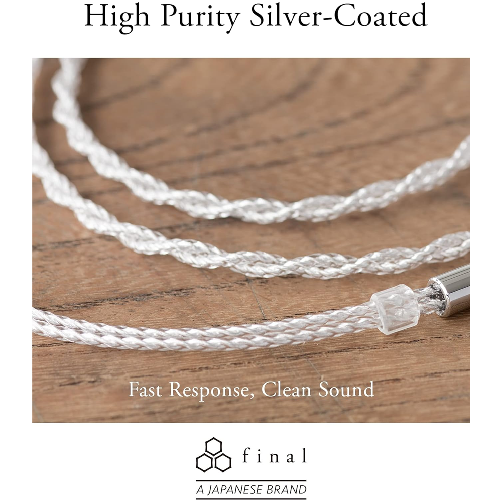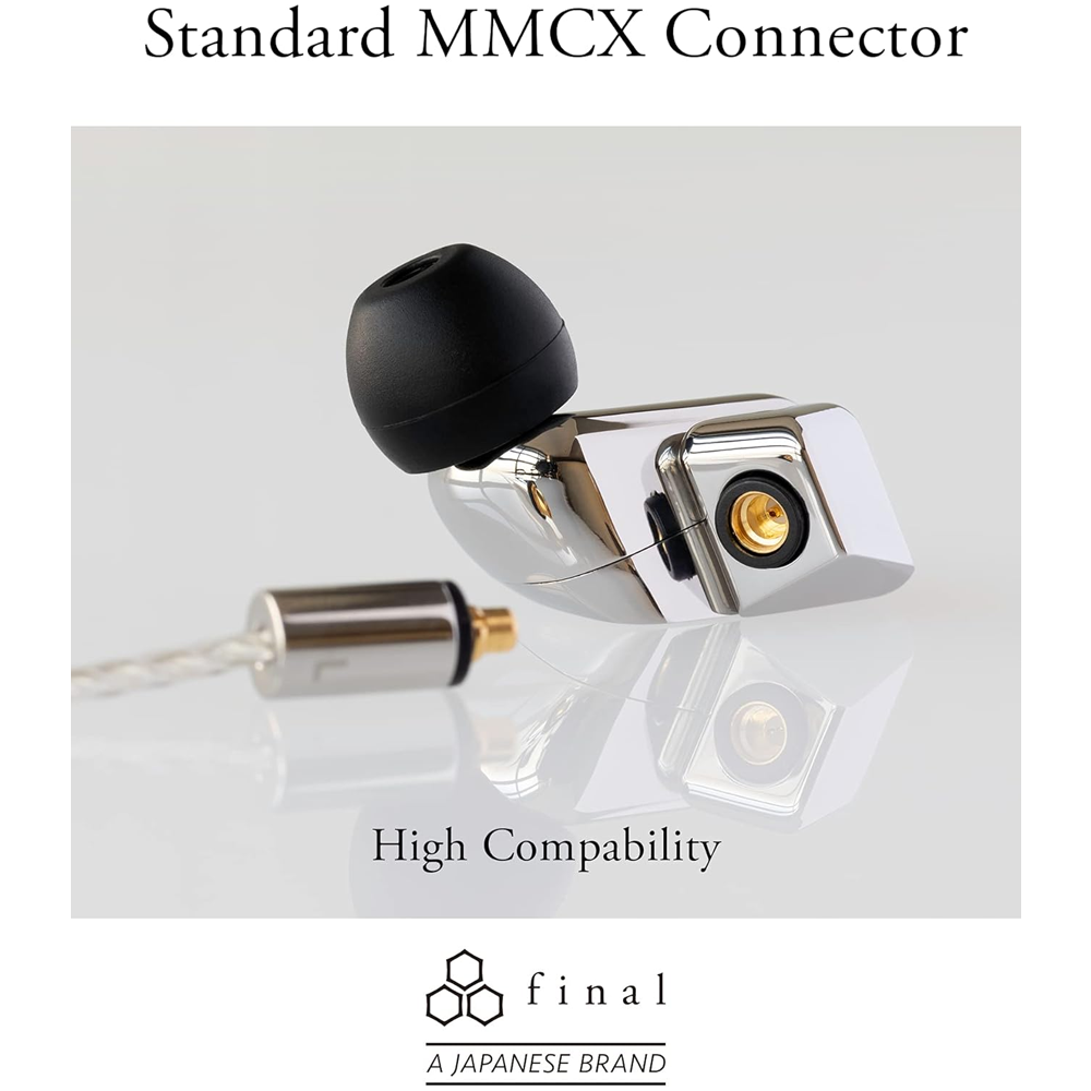 Final Audio розробила свої кабелі для навушників IEM з високочистим кабелем OFC зі срібним покриттям і високоточними швейцарськими роз'ємами MMCX для найкращої передачі сигналу. Штекер MMCX і 4,4-мм міні-штекер витримують понад п'ятдесят тисяч вигинів, що значно перевищує звичайні критерії.
