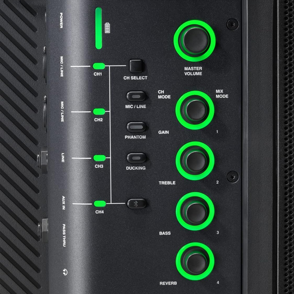 Вбудований 4-канальний мікшер з фантомним живленням, ефектами Lexicon і dbx, Bluetooth і функцією автоматичного приглушення музики під час мови забезпечує швидке налаштування та зручність у використанні. Акумулятор на 6100 мА·год працює до 12 годин і заряджається за 2,5 години.
