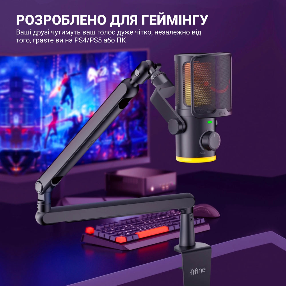 Fifine AmpliGame TAM6 — це ідеальний мікрофон для геймерів, які хочуть чистий звук і зручність. Завдяки регулятору гучності та чутливості, він дозволяє налаштовувати звук гри та чату для чіткої комунікації без перешкод. Вбудоване шумозаглушення зменшує фоновий шум, а конденсаторний капсуль передає чисті високі частоти, що робить його чудовим вибором для ігор та відеоконференцій.