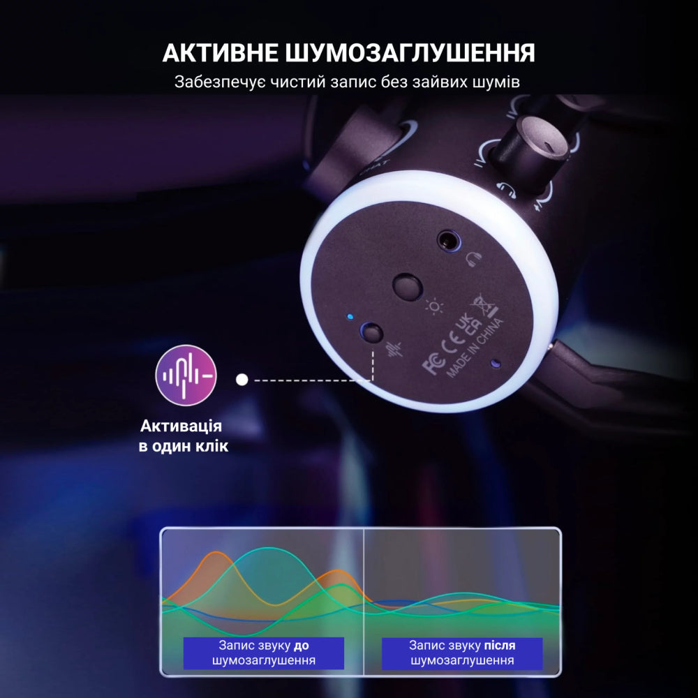 Мікрофон підтримує RGB підсвічування з трьома режимами, що дозволяє створити атмосферу згідно з вашим настроєм чи типом контенту. AmpliGame TAM6 — це не лише якісний звук, а й стильний аксесуар, що підкреслить ваш професіоналізм і створить унікальну атмосферу для будь-якої діяльності.