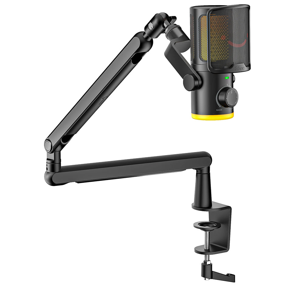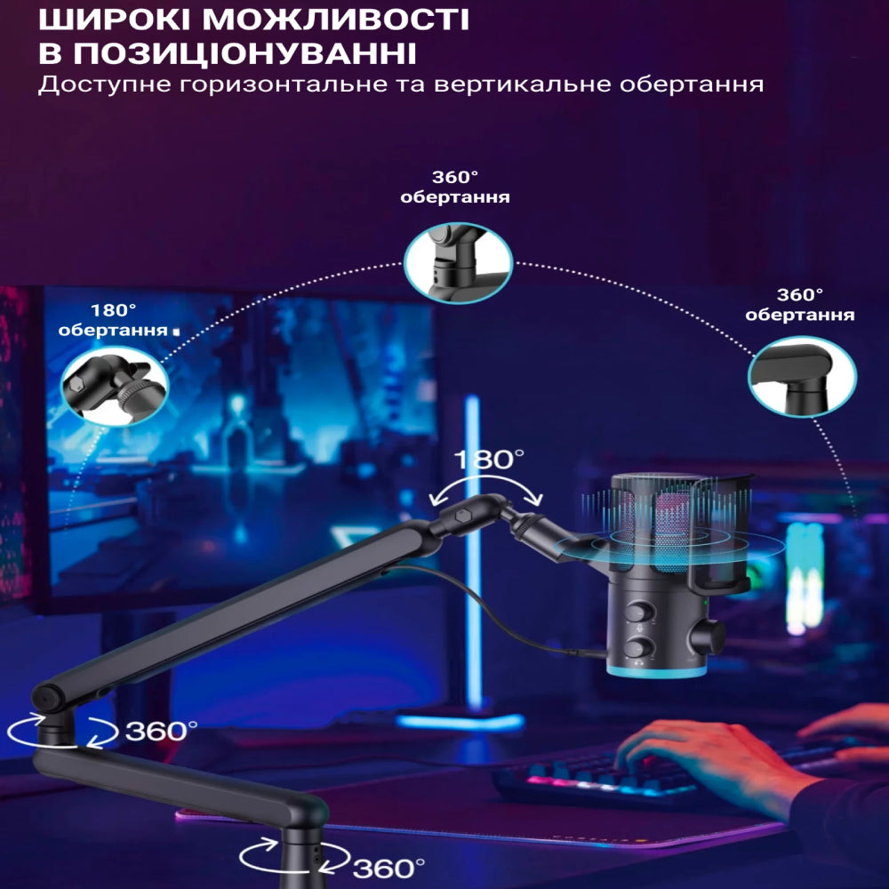 Комплектація: 1xUSB-мікрофон з RGB підставкою, 1xСтійка для мікрофону, 1хПоп-фільтр, 1хСтійка-пантограф, 1хС-подібний затискач, 1хUSB-A USB-C кабель, 1хПосібник користувача