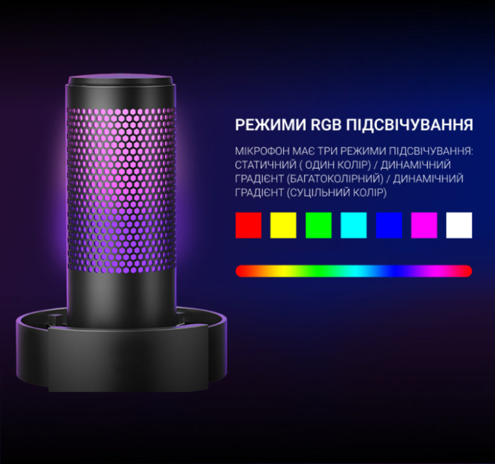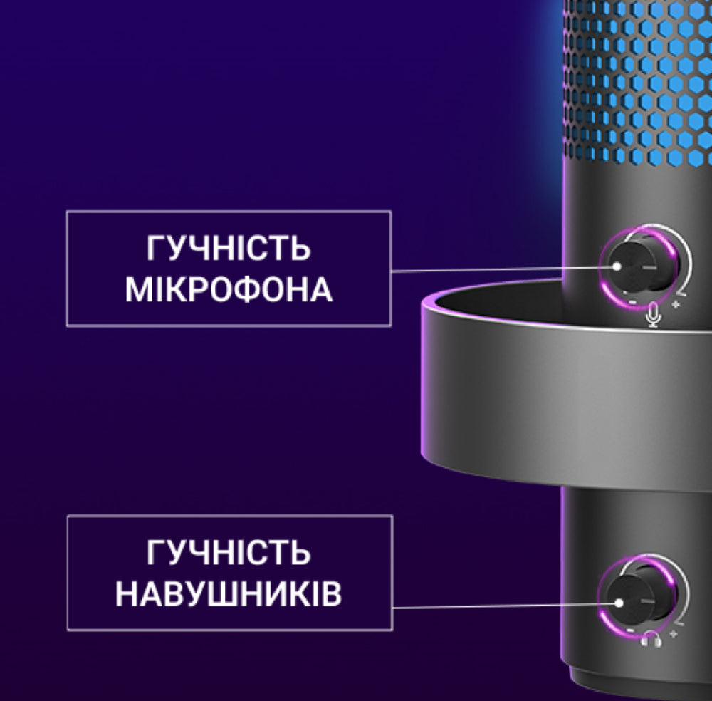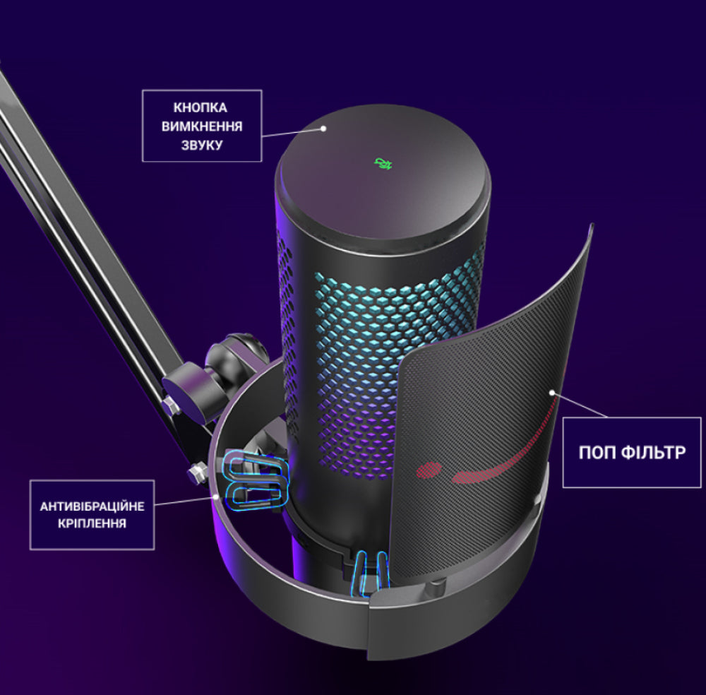 Комплектація: 1 X USB мікрофон; 1 X Настільна підставка; 1 X Кабель USB Type-C до USB-A; 1 X Поп-фільтр з тримачем; 1 X Посібник користувача