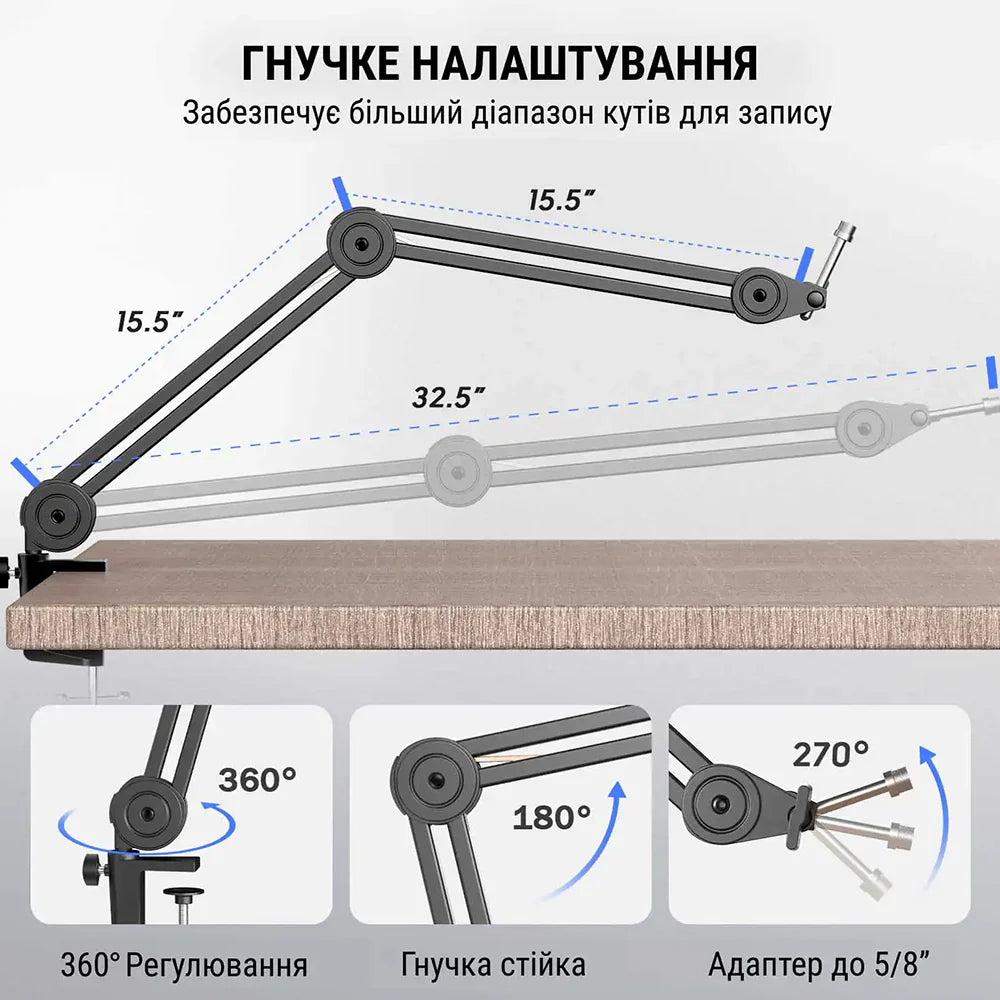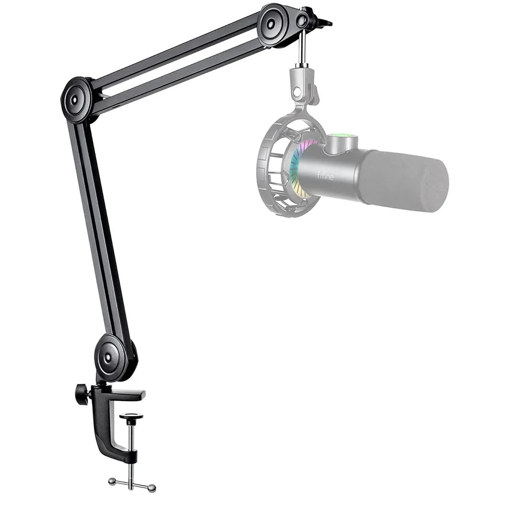 Fifine BM63 – це настільна стійка-пантограф для мікрофона. Призначена для встановлення мікрофону в тісних умовах, наприклад, в апаратних кімнатах радіостанцій, у невеликих студіях або в домашніх умовах. Кріпиться до поверхні за допомогою затискача. Підставка здатна витримати вагу практично будь-якого мікрофона, максимальне навантаження до 2 кг.