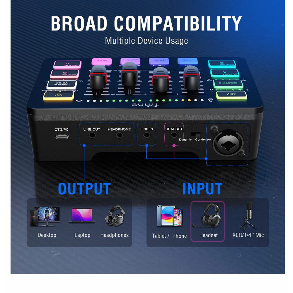 Простота використання — мікшер сумісний із ПК і Mac без потреби в драйверах, має фізичні фейдери, кнопки Mute і RGB-підсвічування для керування в режимі реального часу.