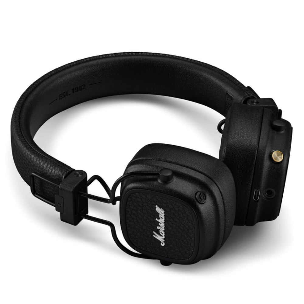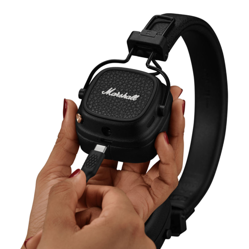 Marshall Major V — це бездротові Bluetooth-навушники, а точніше гарнітура, оскільки оснащені вбудованим мікрофоном. Конструктивно ця модель майже не відрізняється від свого попередника четвертої серії, за винятком нової кнопки «М» для розширеного управління. Щодо зовнішнього вигляду, за свою ціну ви навряд чи знайдете щось красивіше та елегантніше. Дизайн навушників у міру старомодний, що цілком зрозуміло — впізнаваність бренду Marshall має бути стовідсотковою. При цьому Marshall досі не провів ребрендинг, тому логотип – напис Marshall, виконаний фірмовим шрифтом, – залишається незмінним, як і 50 років тому. Втім, Marshall Major V не лише чудово виглядають, але й вирізняються відмінною ергономікою! Вони дуже легкі й зовсім не тиснуть ні на вуха, ні на голову. На правій чашці розташовані універсальна кнопка-джойстик, роз'єм USB-C для зарядки та аналоговий вхід/вихід 3.5 мм. На лівій чаші з'явилася нова кнопка "М", яку можна налаштувати для активації Spotify Tap, зміни налаштувань еквалайзера або виклику голосового помічника.