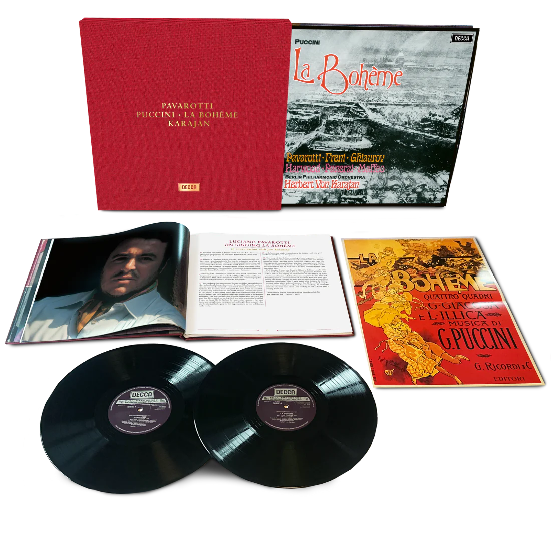 Цей подвійний вініл представляє знамениту постановку опери Джакомо Пуччіні La Bohème у виконанні Луціано Паваротті, Мірелли Френі та під диригуванням Герберта фон Караяна. Запис вважається однією з найвпливовіших інтерпретацій твору та демонструє неперевершену майстерність вокалістів і диригента, передаючи романтичну і трагічну атмосферу опери.