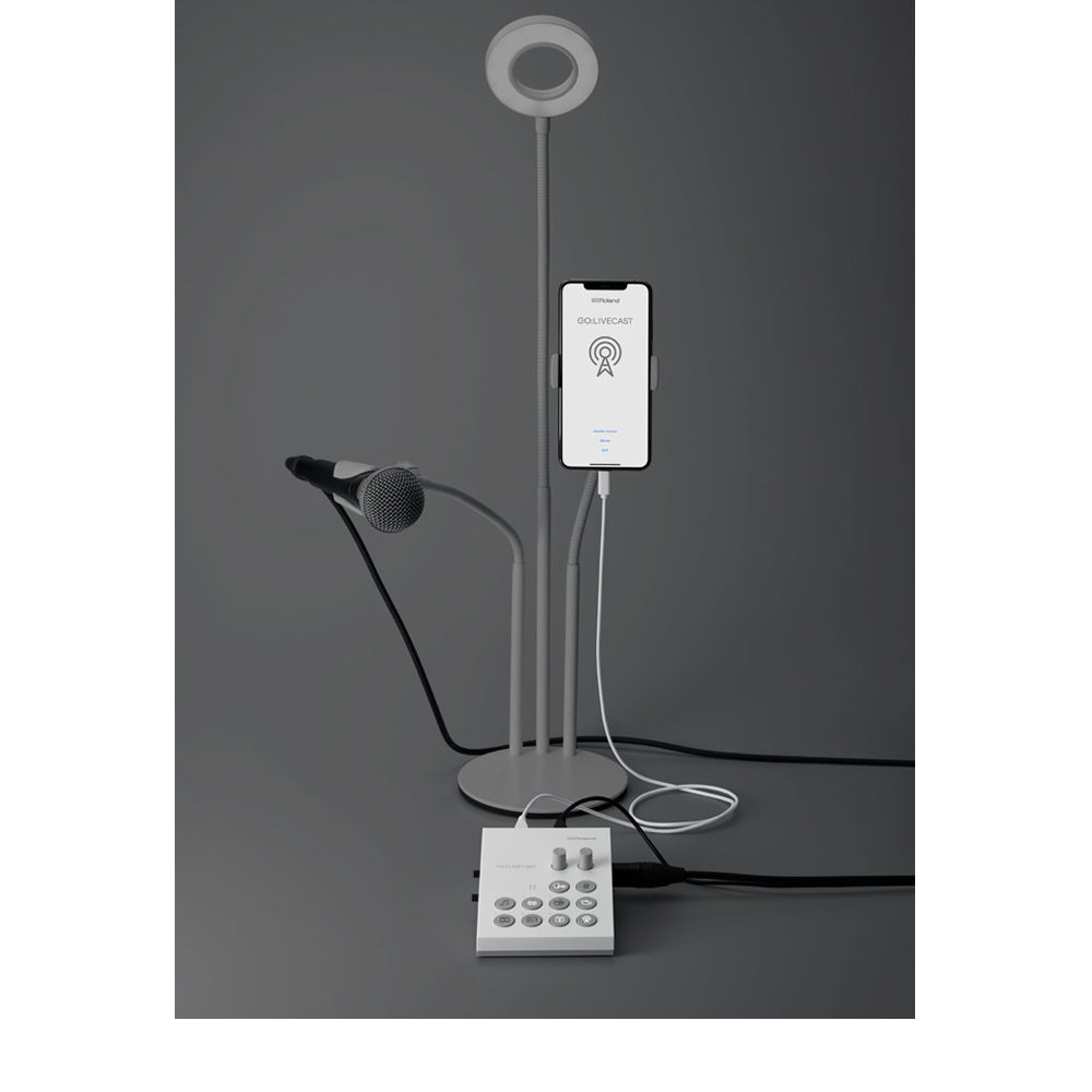 Roland GO:LIVECAST — це портативна апаратна студія, яка миттєво перетворює твій смартфон на професійний інструмент для прямих трансляцій. Забудь про складні налаштування комп'ютера та громіздке обладнання: просто підключи телефон, і ти готовий виходити в ефір на YouTube, Twitch, Facebook Live чи TikTok з високою якістю зображення та звуку. Пристрій працює у тандемі зі спеціальним додатком, дозволяючи тобі мікшувати звук, запускати титри, відеовставки та фотографії одним натисканням фізичної кнопки, надаючи твоїм мобільним стрімам вигляду повноцінного телевізійного шоу.