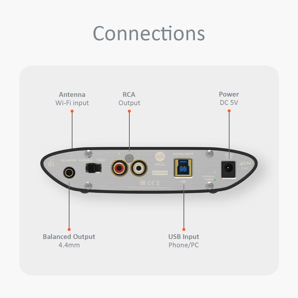 Управління мінімалістичне: рифлений регулятор гучності, кнопки PowerMatch і TrueBass, перемикач режиму RCA-виходу. Підключення — через USB 3.0, навушникові виходи 6.3 мм і 4.4 мм, RCA та 4.4 мм балансний вихід. Працює від USB, але є порт для окремого живлення.