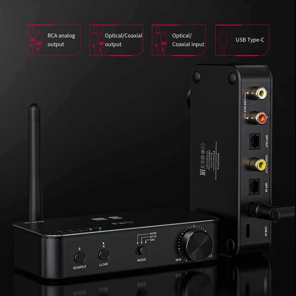 Незважаючи на компактний розмір, BTA30 Pro має широкі можливості підключення: USB-C, оптичний, коаксіальний вхід/вихід, RCA, Bluetooth 5.0. Чіп Qualcomm CSR8675 забезпечує стабільну роботу з високою якістю передачі.