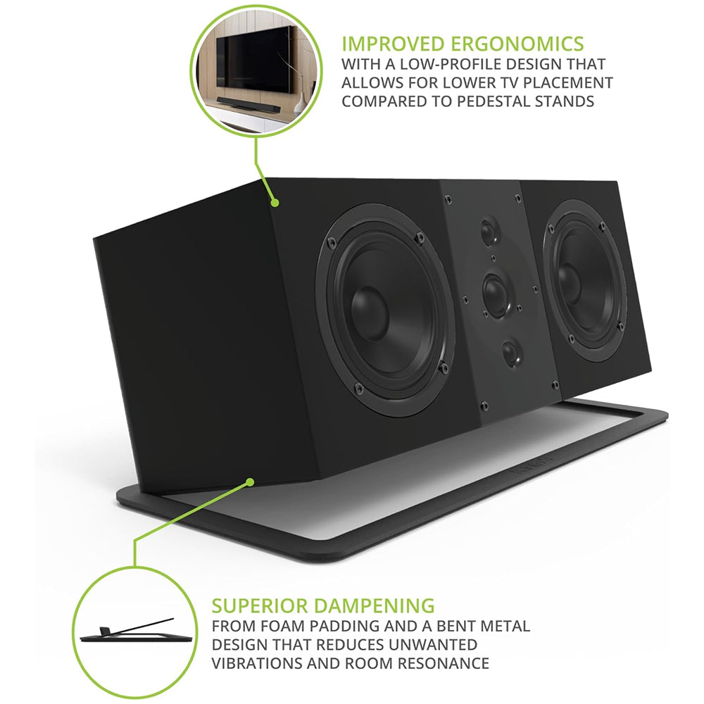 Підставка для центрального каналу S10 дозволяє слухачам повністю розкрити потенціал компактного центрального каналу або висококласного саундбару. Нахил на 12 градусів направляє динамік до вуха слухача, а піднімаючи колонку з поверхні меблів зменшує відбиття звуку та покращує його чіткість. Піна для демпфування та зігнута металева конструкція поглинають вібрації, зменшуючи відволікаючі шуми, викликані резонансами в кімнаті. Низькопрофільний дизайн дозволяє розмістити телевізор на більш низькому рівні порівняно з традиційними підставками для колонок, що забезпечує комфортнішу позицію для перегляду. Підставка S10 сумісна з центральними каналами і саундбарами глибиною 5,5-6,9 дюймів (13,9 – 17,5 см) і шириною 16-36 дюймів (40,6 - 91 см).