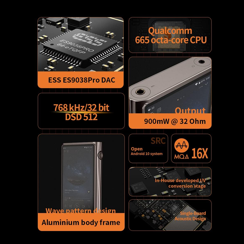 Оснащений потужним ЦАП ESS ES9038PRO (до 32 біт / 768 кГц та DSD512), а також кастомним підсилювачем із опамами DA4896-2, MUSES8920, OPA2211 і BUF634. Потужність: 400 мВт (3.5 мм) і до 900 мВт (балансний 4.4 мм).