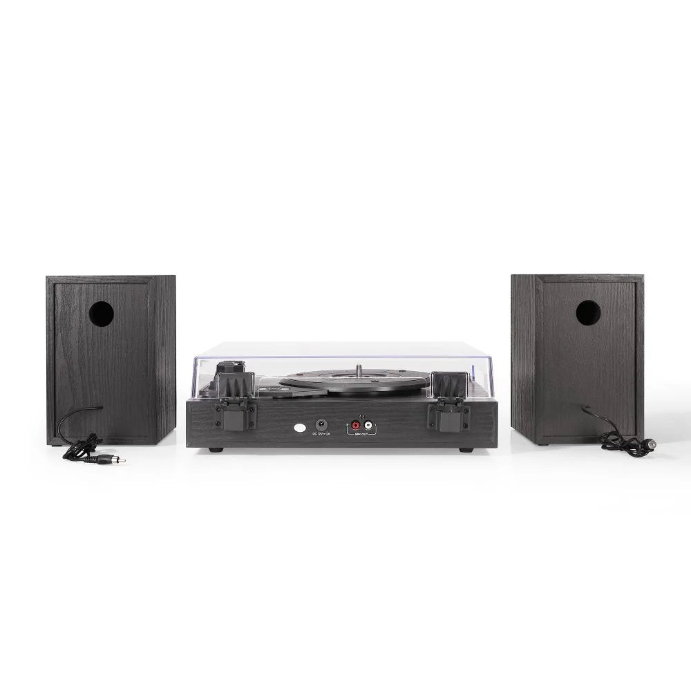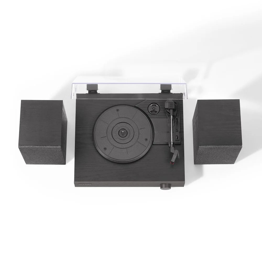 Комплект постачається з усім необхідним: тонарм, голка, адаптер для 45‑швидкостей, зовнішні колонки, а також кришка‑пилозахист. Оформлення з LED‑індикатором стану, чистий чорний корпус із металевими акцентами та фірмовий дизайн роблять пристрій гарним елементом інтер’єру.