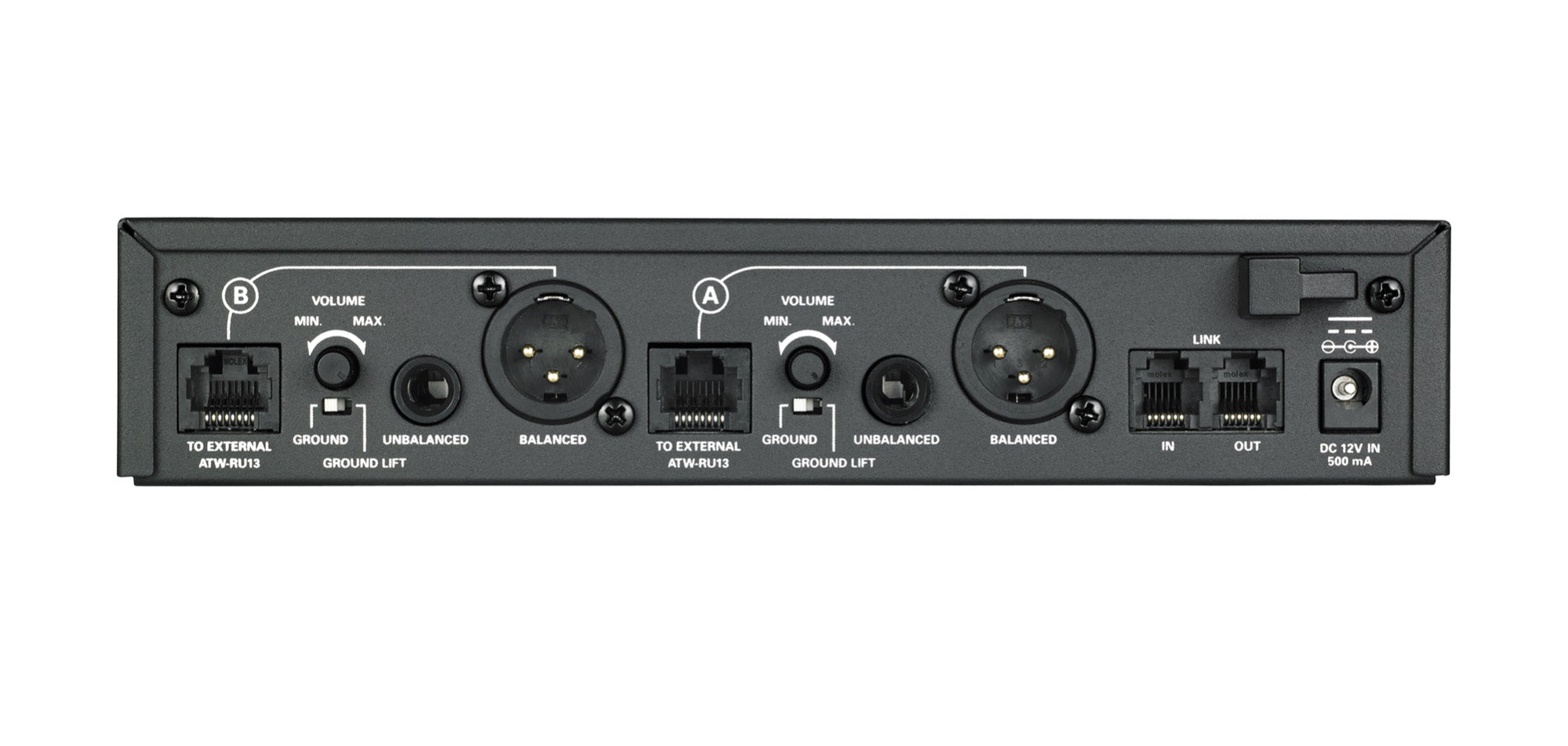 ATW-RC13 обладнаний двома аудіовиходами для кожного приймача: збалансований XLR-вихід та незбалансований телефонний роз'єм ¼ дюйма TRS.
