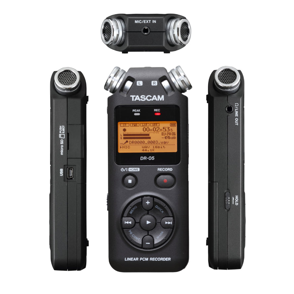 Tascam DR-05 - портативний рекордер, який ідеально підходить як для використання в побуті, так і в професійній сфері. Дана модель оснащена конденсаторними мікрофонами, які мають чутливість до 125 дБ SPL і низький рівень шуму. DR-05 записує на MicroSD або MicroSDHC у форматі MP3 або WAV (BWF) при максимальних характеристиках до 24-біт, 96 кГц. Також цей рекордер оснащений функцією Peak reduction, яка встановлює оптимальний рівень запису, і функцією Variable-Speed Audition, яка змінює швидкість відтворення без зміни висоти тону.