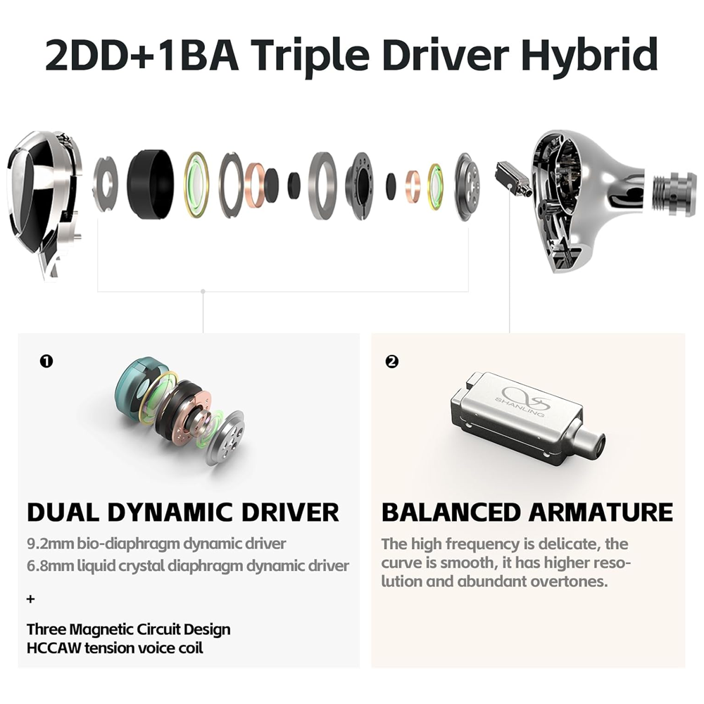 Навушники Shanling Sono — це гібридна модель з конфігурацією 2 динамічні драйвери + 1 арматурний, яка забезпечує збалансоване, виразне звучання: глибокі та м’які низькі, натуральний вокал і чисті, деталізовані високі частоти.