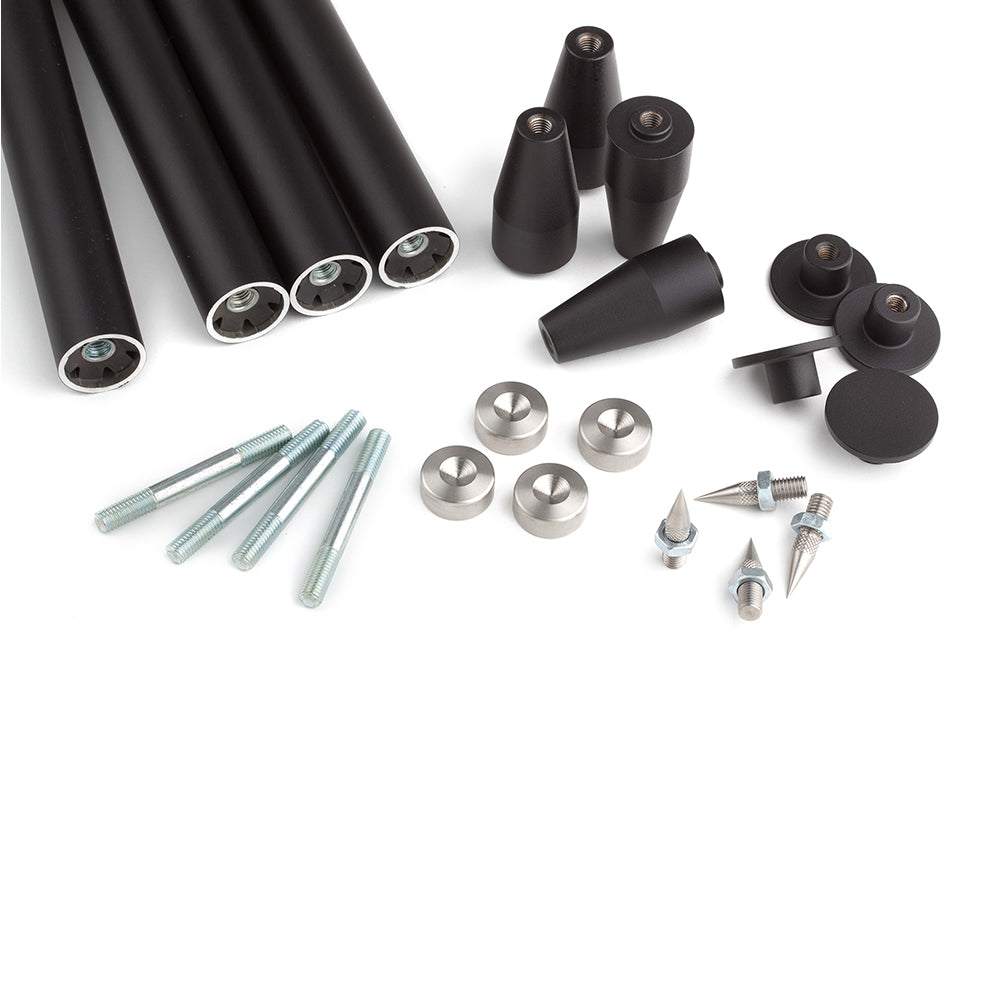 • Матеріали: стійки — анодований алюміній із внутрішнім демпфувальним наповненням; полки — MDF із полімерним ламінатом; фурнітура — нержавіюча сталь, штирі, захисні диски, AVP-термінали з цинковим покриттям.