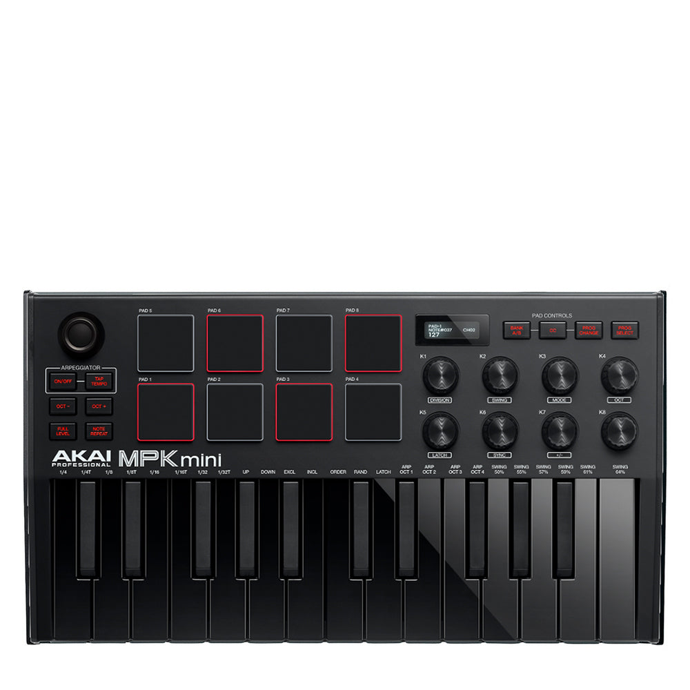 AKAI PRO MPK Mini MK3 - високочутлива MIDI-клавіатура з 25 клавішами зменшеного розміру, третя версія популярної моделі MPK Mini. Модель отримала оновлену динамічну клавіатуру Gen 2 і лісплей для відображення параметрів. Контролер має 4-позиційний джойстик для управління модуляцією і динамікою тону, 8 педів у стилі MPC з підсвічуванням і чутливістю до швидкості натискання і 8 призначуваних Q-Link ручок. Пристрій оснащений кнопками підвищення і зниження октави, а також входом для сустейн педалі. Крім того, на борту є вбудований арпеджиатор і функції повноцінних робочих станцій MPC - Note Repeat і Full Level. Пристрій підтримує систему підключення plug-and-play, функцію USB-MIDI і живлення по USB. У комплект входять також 2 Гб семплів і ліцензійні ключі для програми MPC Beats і віртуальних інструментів Bassline, Tubesynth, Electric, Hybrid 3, Mini Grand і Velvet.
