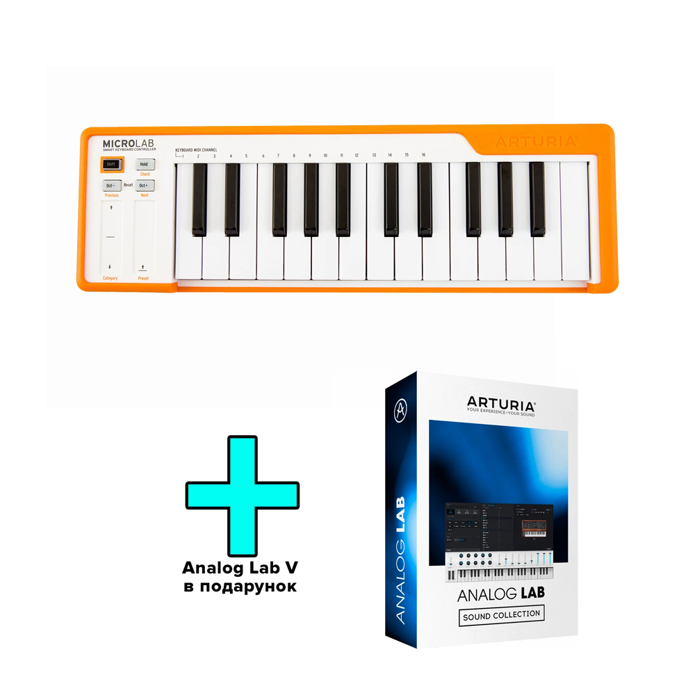 Arturia MicroLab — компактний USB-MIDI контролер. Контролер має 25 чутливих до швидкості натискання міні-клавіш - таких самих, що й на відзначених нагородами контролерах KeyStep і Arturia MiniLab MK II. Завдяки чотирьом кнопкам і двом сенсорним смугам ви можете легко перемикати октави, запускати акорди з однієї ноти, активувати сустейн, налаштовувати висоту і модуляцію, перегортати пресети і багато іншого. Клавіатура живиться від USB, причому USB-кабель поміщений у вбудований втоплений кабельний канал на корпусі, що запобігає його пошкодженню під час транспортування. Яскравий стильний прогумований корпус також захищає контролер від зовнішніх впливів. Контролер працює з комп'ютерами Mac (10.11 і вище) і Windows (7 і вище), а також мобільними пристроями і може живитися від пристроїв iOS або Android. У комплекті з контролером поставляється потужний набір програмного забезпечення Analog Lab Lite і Bitwig 8-Track для написання, запису і мікшування ваших пісень, а також більш ніж 600 попередньо встановлених звуків синтезаторів і клавішних з бібліотек V Collection і UVI Grand Piano Model D.