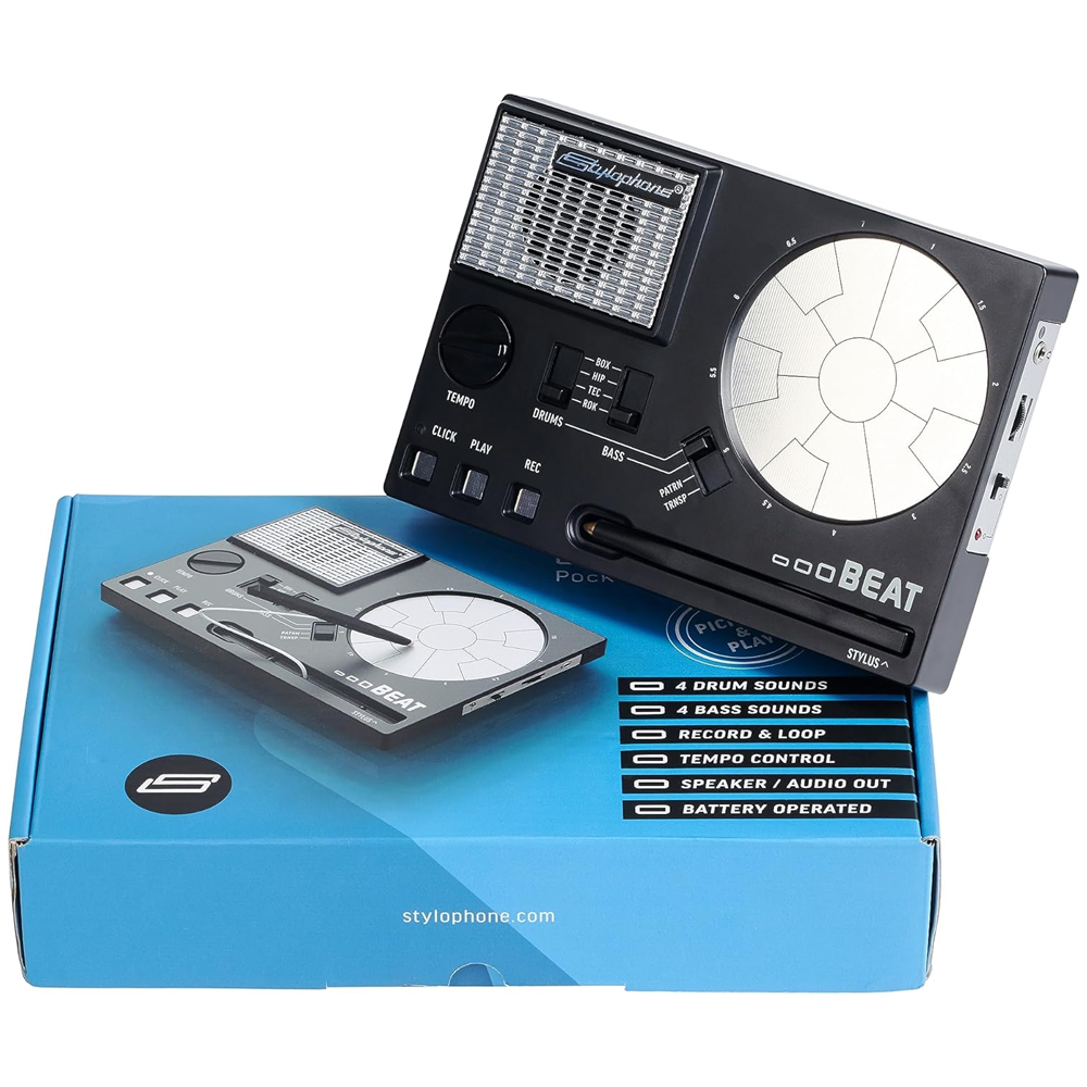 Stylophone BEAT — це кишенькова драм-машина, що дозволяє створювати ритми та басові лінії будь-де й будь-коли. Не обов’язково бути барабанщиком — за допомогою чотирьох звукових банків (ROK, TECHNO, HIPHOP, BEATBOX) легко створювати ударні петлі та баси.